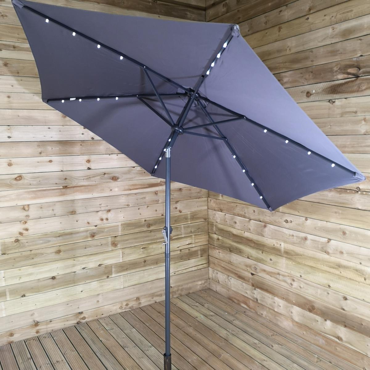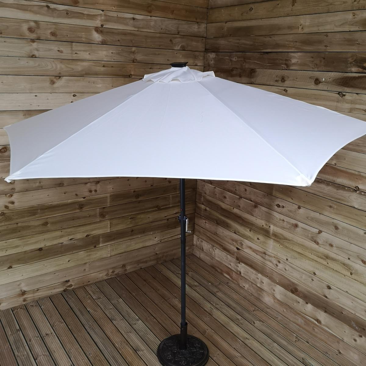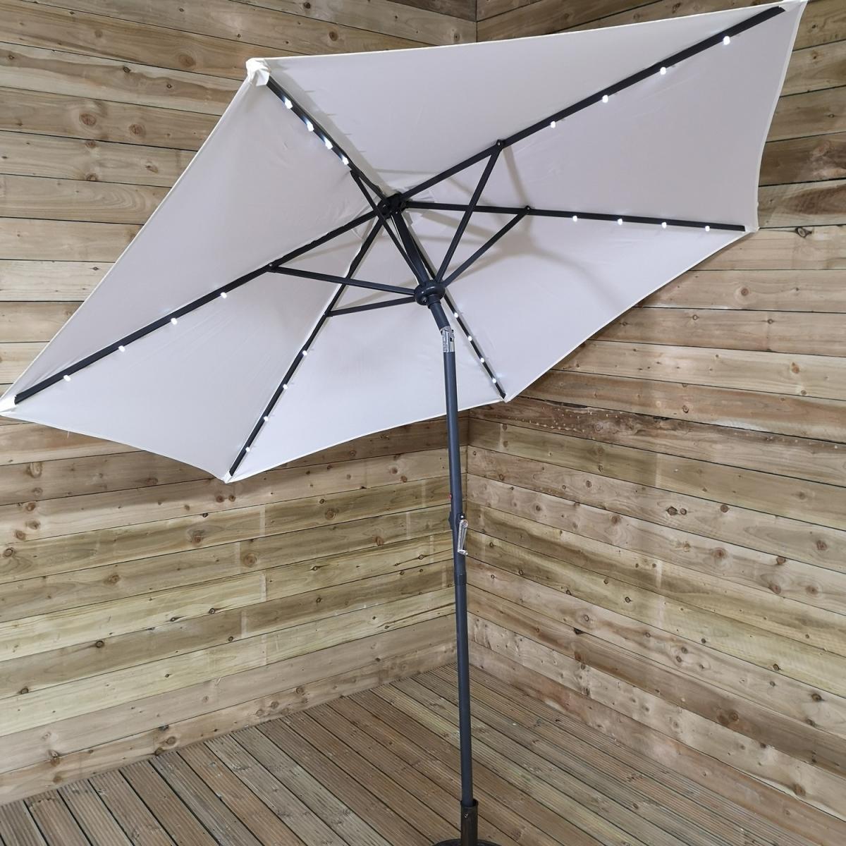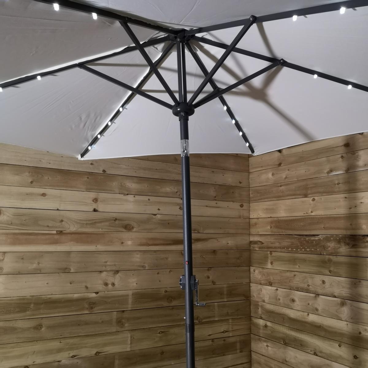 This light-up SPF30 parasol is perfect to create some shade and protect you from the sun's harmful UV rays, whilst doubling up as a source of lighting once the sun has set. Simply attach the solar unit to the top of the canopy, and connect the two poles, ensuring that the locking clips are secured. Wind the crank handle to raise and lower the steel ribs, tilt mechanism can be activated by the press on a button and turning on the lights at the flick of a switch. The replaceable battery takes approximately 8-12 hours to charge in normal daylight, the lamp illuminates for around 6 hours. Simply wipe clean with a damp sponge or cloth and allow to dry. We would recommend using the parasol with a sturdy base, (sold separately), and must be safely stored when not in use.