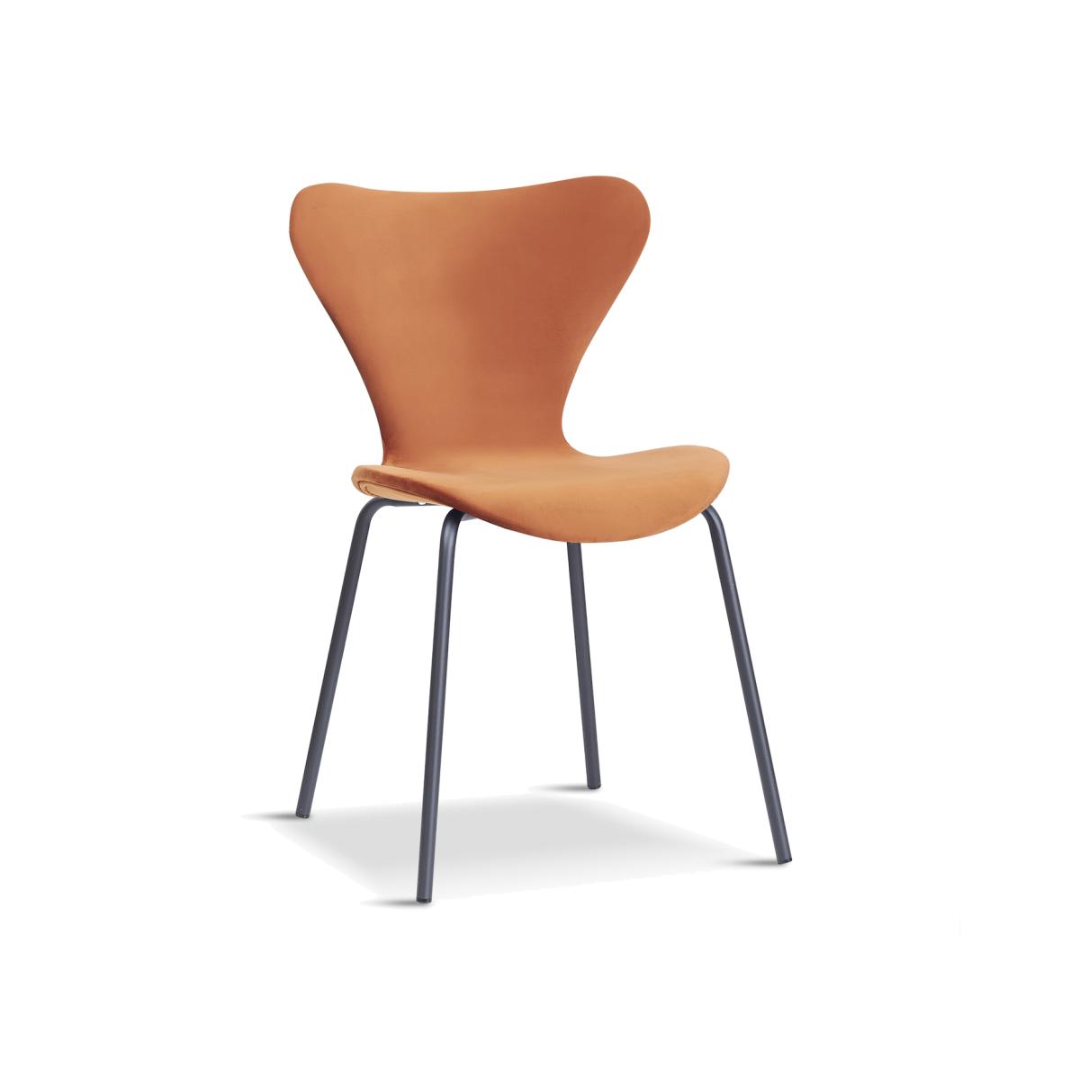 Set of 2 orange dining chairs featuring sleek black metal legs. The wing-shaped seat is upholstered in velvet fabric and padded for comfort. These chairs aren't just about captivating design, they are also fully stackable. Ideal for modern dining rooms, they suit busy households that seek both functionality and contemporary style.