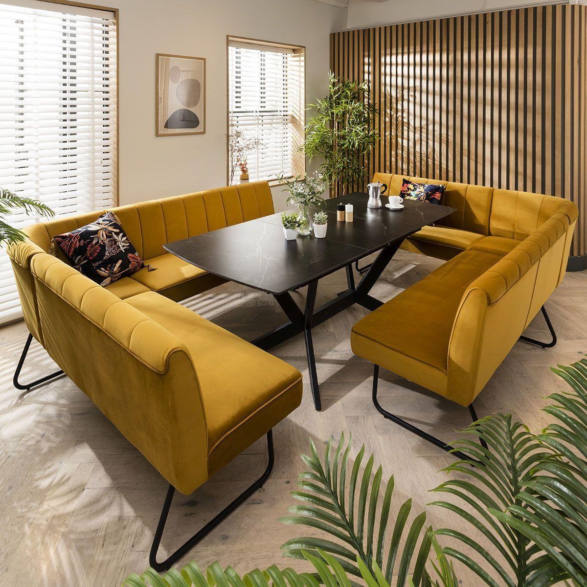 The Deco Corner Dining Bench Set is a versatile and stylish seating solution for any dining space. This corner bench set can comfortably seat up to 8 people. Bench dining sets offer a perfect gathering spot for friends and family. The premium mustard velvet upholstery is luxurious in its richness and vibrancy. Crafted with attention to detail, our Corner Dining Bench Set features a sleek black powder-coated tubular frame. You can easily configure it to fit your space by choosing between left or right-hand placement. This adaptability allows you to optimise your dining area, no matter the size or layout of your room. The soft cushioning enhances the overall comfort, allowing you to enjoy a relaxed and enjoyable dining experience every time. The Deco dining table is a perfect blend of functionality and style. With its auto-lift feature, extending the table has never been easier. Simply pull one side, and watch as the extension effortlessly pops up into place, giving you extra space in a matter of seconds. Crafted with utmost precision, this table boasts a premium black ceramic top with a captivating marble-effect finish. Not only does it exude elegance, but it also offers remarkable durability. The scratch, heat, and stain-resistant ceramic ensures that your table remains in pristine condition for years to come, even with everyday use. Designed to complement contemporary settings, this bench showcases a modern line tufted upholstery. The tufted details not only create a visually appealing look but also provide additional support. With our Corner Dining Bench, you can elevate the style and functionality of your dining space effortlessly. W320cm D240cm H82cm Seat Height 49cm Seat Depth 46cm Corner Bench Dining Set with Ceramic Marble Table including 2 Benches