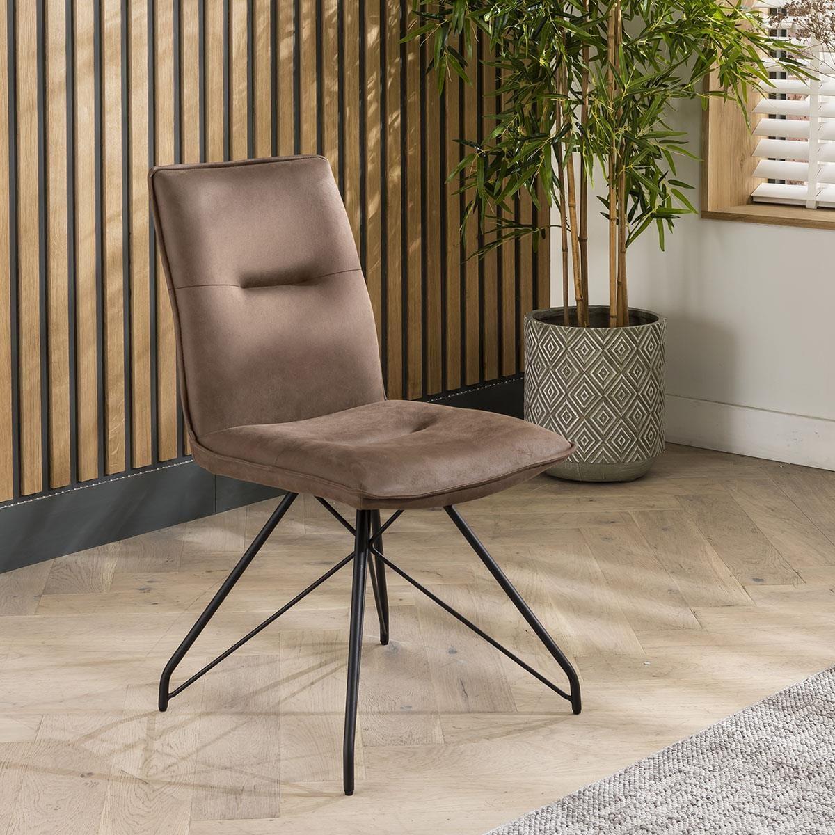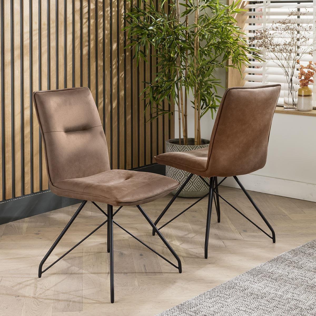 This set of 2 dining room chairs, a perfect blend of style and comfort. Crafted with hardwearing brown leather-look fabric upholstery, the kitchen chairs add a touch of industrial-chic to any space. The dining chairs boast clean lines accentuated by simple tufting details bestow a modern edge in kitchen or dining room. Designed for the modern home, these chairs feature black powder coated hairpin legs that seamlessly combine industrial aesthetics with contemporary charm. The sleek and sturdy hairpin legs not only provide exceptional stability but also contribute to the overall modern appeal of these chairs. Indulge in the plush comfort of the hardwearing leather-look brown fabric upholstery, which not only feels delightful to the touch but also ensures long-lasting durability. The rich brown colour complements a wide range of interior styles, adding warmth and elegance to your dining area. Whether you're hosting a formal dinner or enjoying a casual meal, our set of 2 dining chairs offers both comfort and style. With their modern industrial design and impeccable craftsmanship, these chairs are sure to be the highlight of your dining experience, making every meal a memorable one. W64cm D49cm H91cm Set of 2 Fabric Dining Chairs Pair them with the matching corner bench
