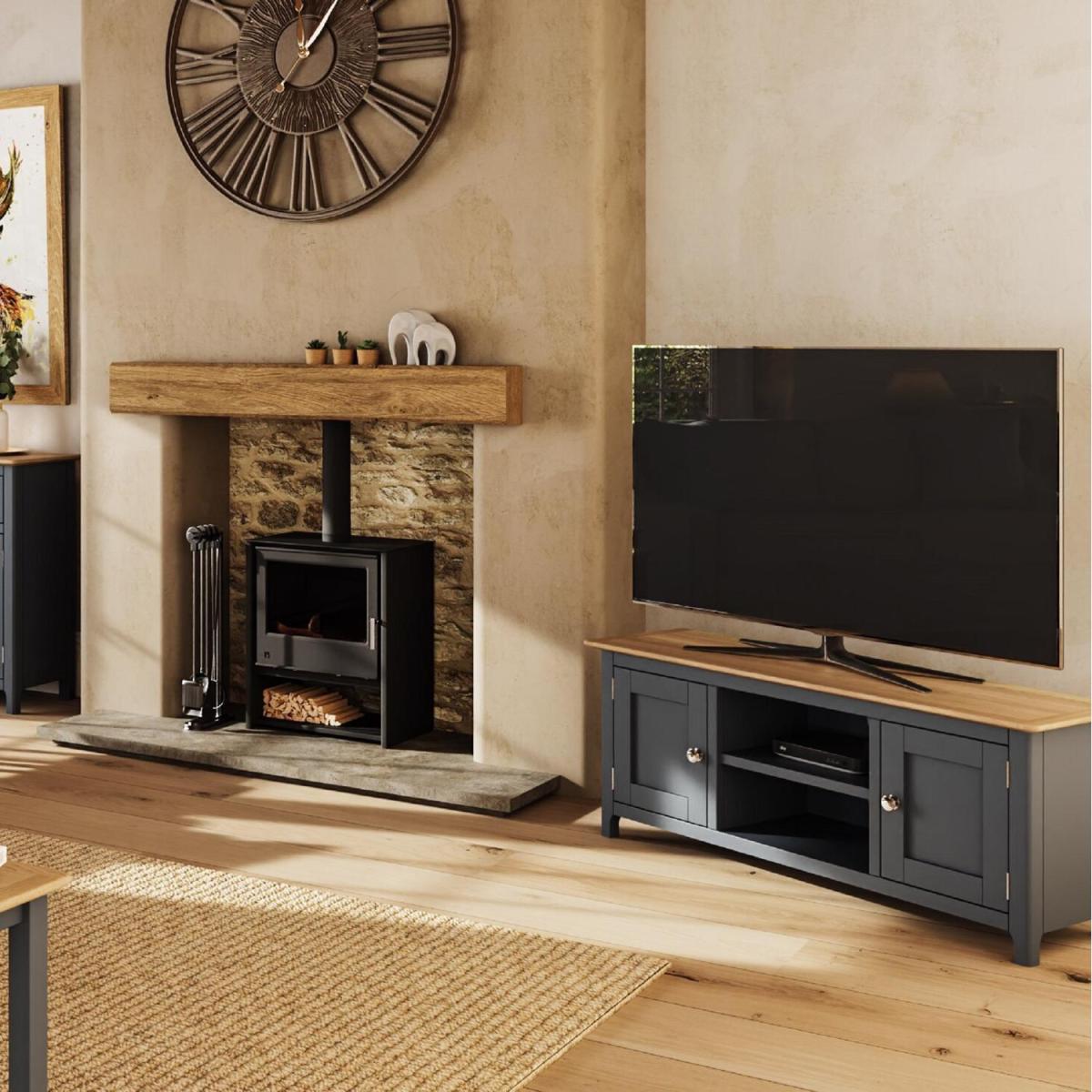 I’m a big fan of this graphite-blue oak TV cabinet - the natural oak top brings warmth while the muted blue body adds a modern twist. Its simple, sturdy design suits everything from Scandi‐inspired lounges to relaxed coastal or modern farmhouse schemes. For styling, tuck media boxes and cables into baskets on the open shelf, use the cupboards for games or DVDs, then balance a low‐profile lamp or sculptural vase on one side of the top with a stack of books or a small plant on the other. Because it arrives fully assembled, you can spend less time on setup and more on personalising the look.