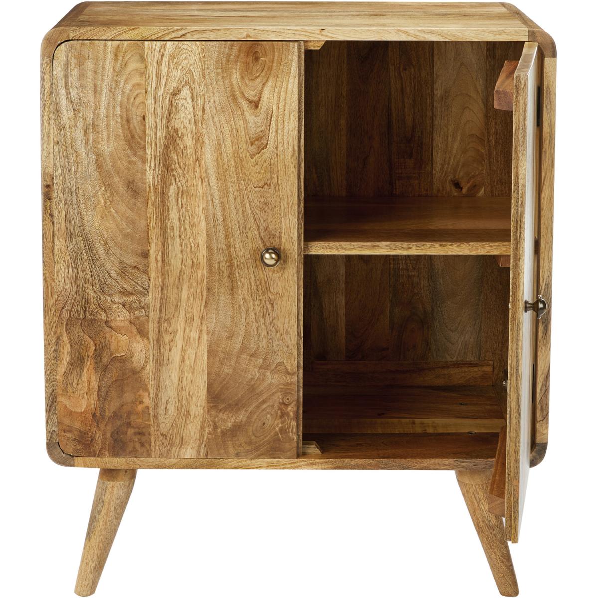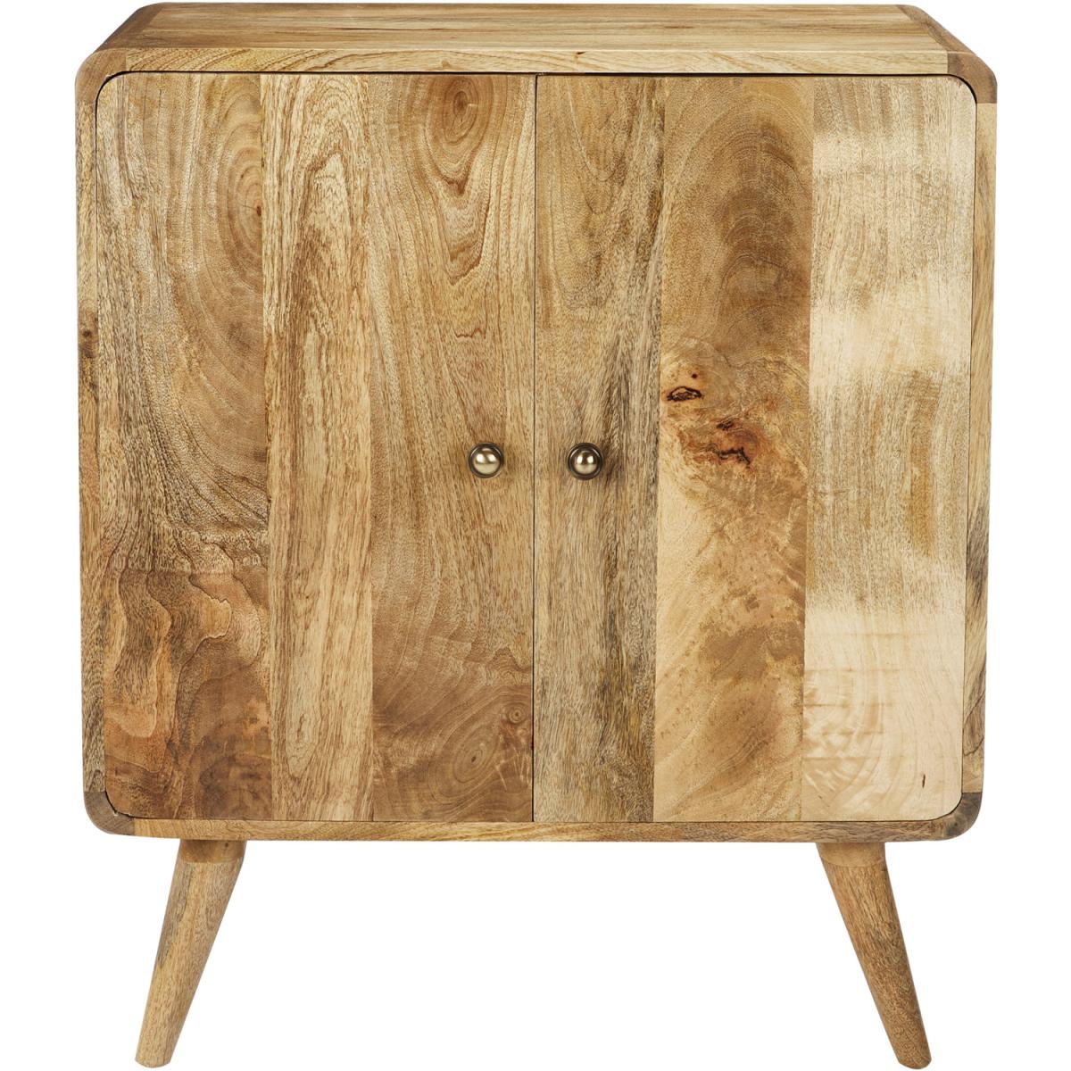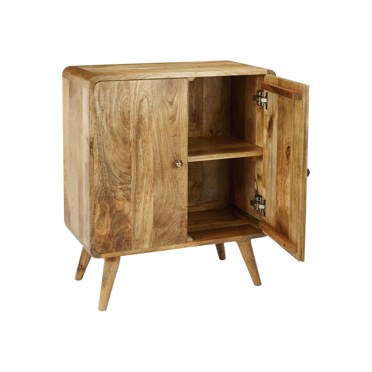 This mid-century style 2 door sideboard is made from 100% solid Mango wood (no veneer) and finished in a light oak stain and wax with a clear lacquer topcoat. With its rounded sides and hairpin legs the style lends itself to any modern or traditional home. This item will be delivered part assembled with only the legs to attach and it is ready to use.