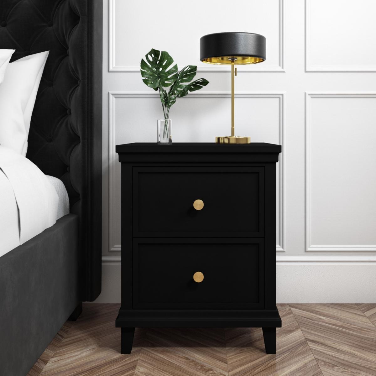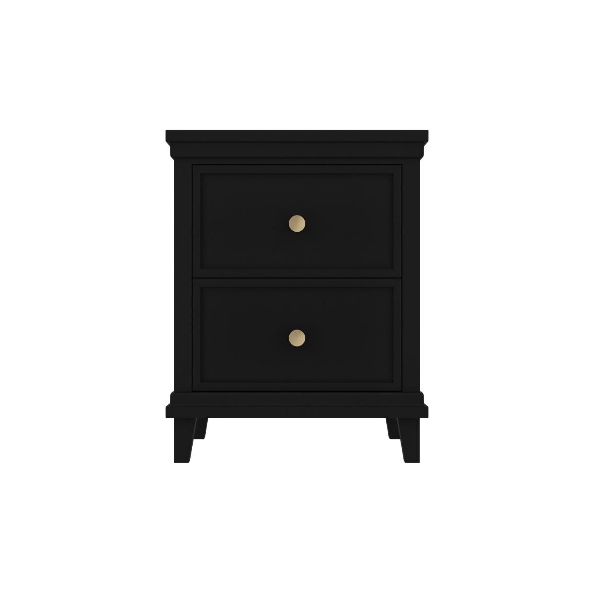 Stylish contemporary design with shaker detailing Beautiful black finish coordinates well with any décor Two spacious drawers are perfect for any essentials Brushed-gold coin handles add a classy finishing touch There's no assembly required so it can use right away Matching items available in the Georgia range Need to know Packaging weight: 25.6kg Number of drawers: 2 Colour: Black and gold (handles) Finish: Painted Material: Solid pine frame, acacia (legs) and metal ball bearing runners Weight: 23kg Assembly required: No