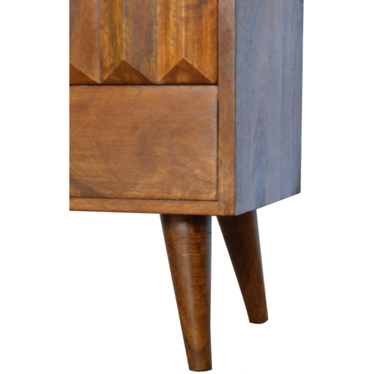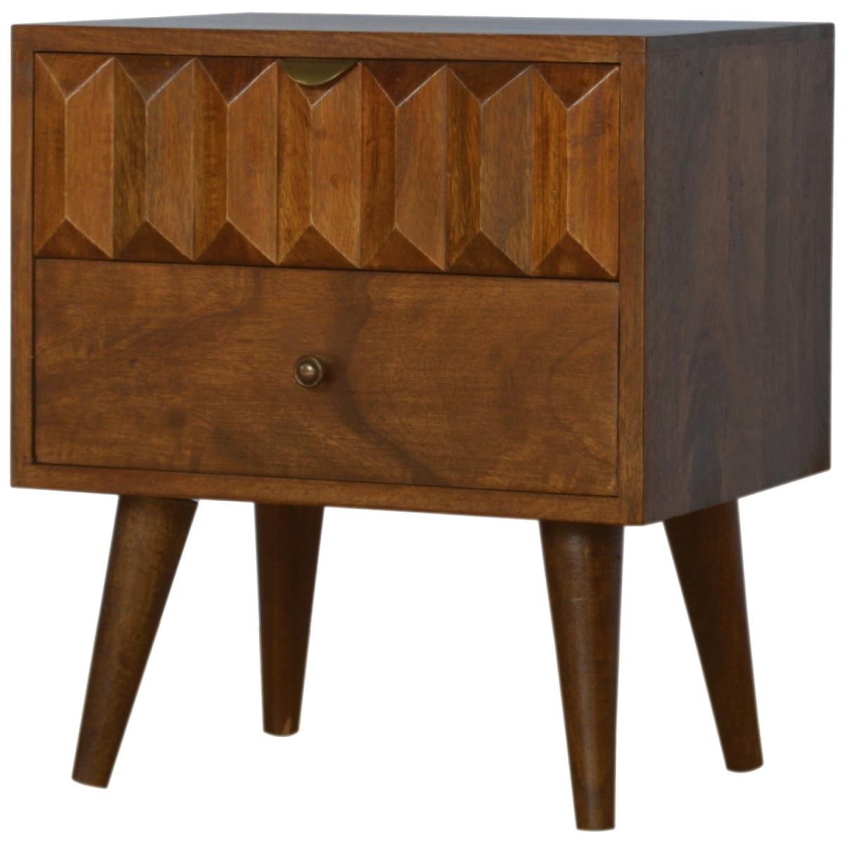 Enjoy the beauty of this bedside in your bedroom, constructed from 100% solid wood in a chestnut finish. It features 4 tapered handcrafted legs and two deep drawers to take care of everyday utility items. The main feature is the raised prism drawer front. This bedside adds a nice touch and lasting character to your bed or living room.
