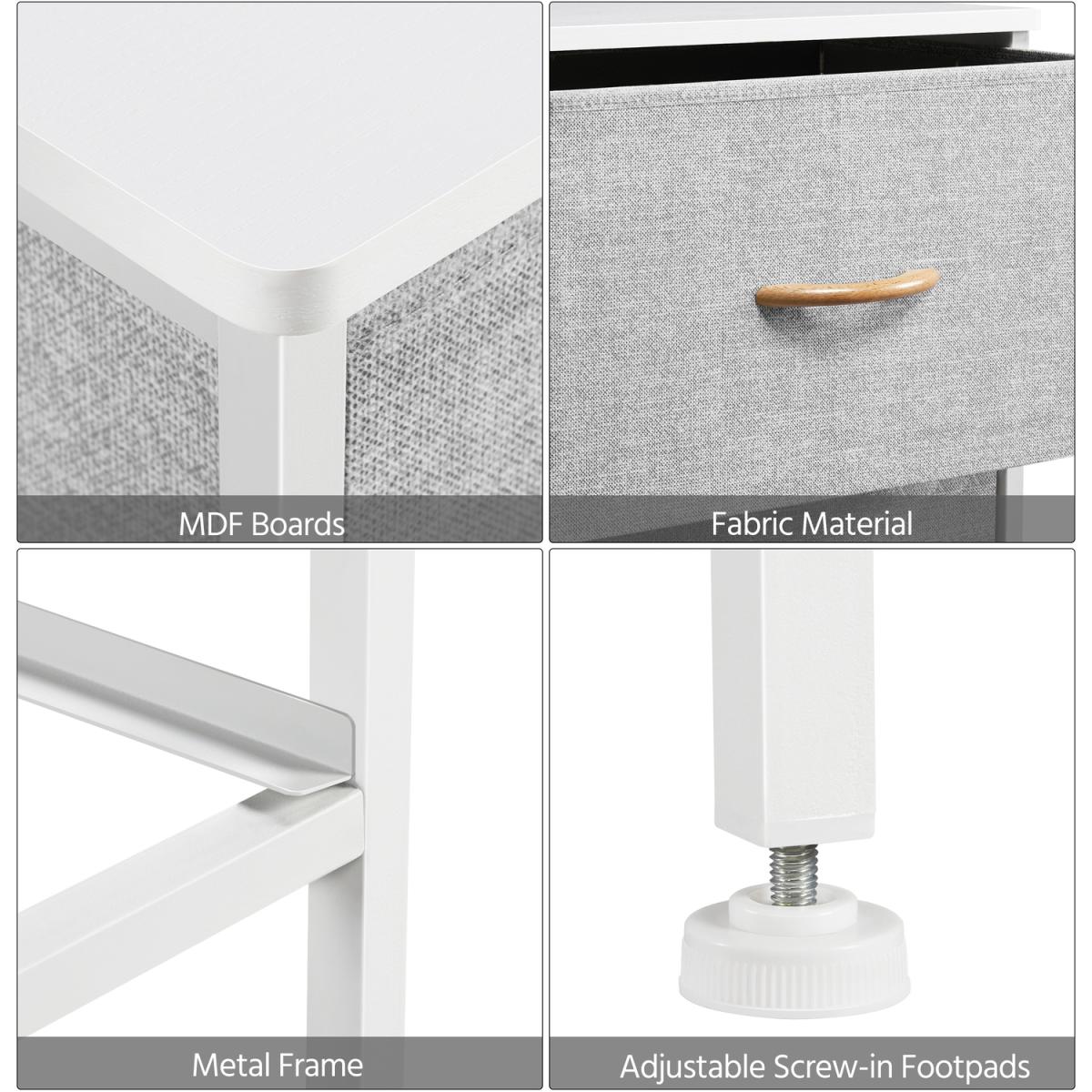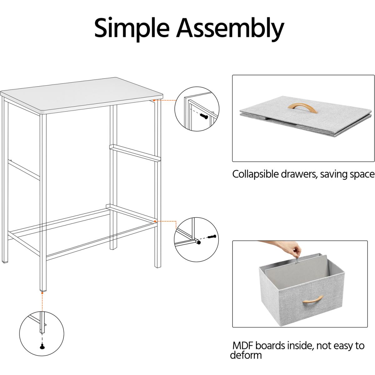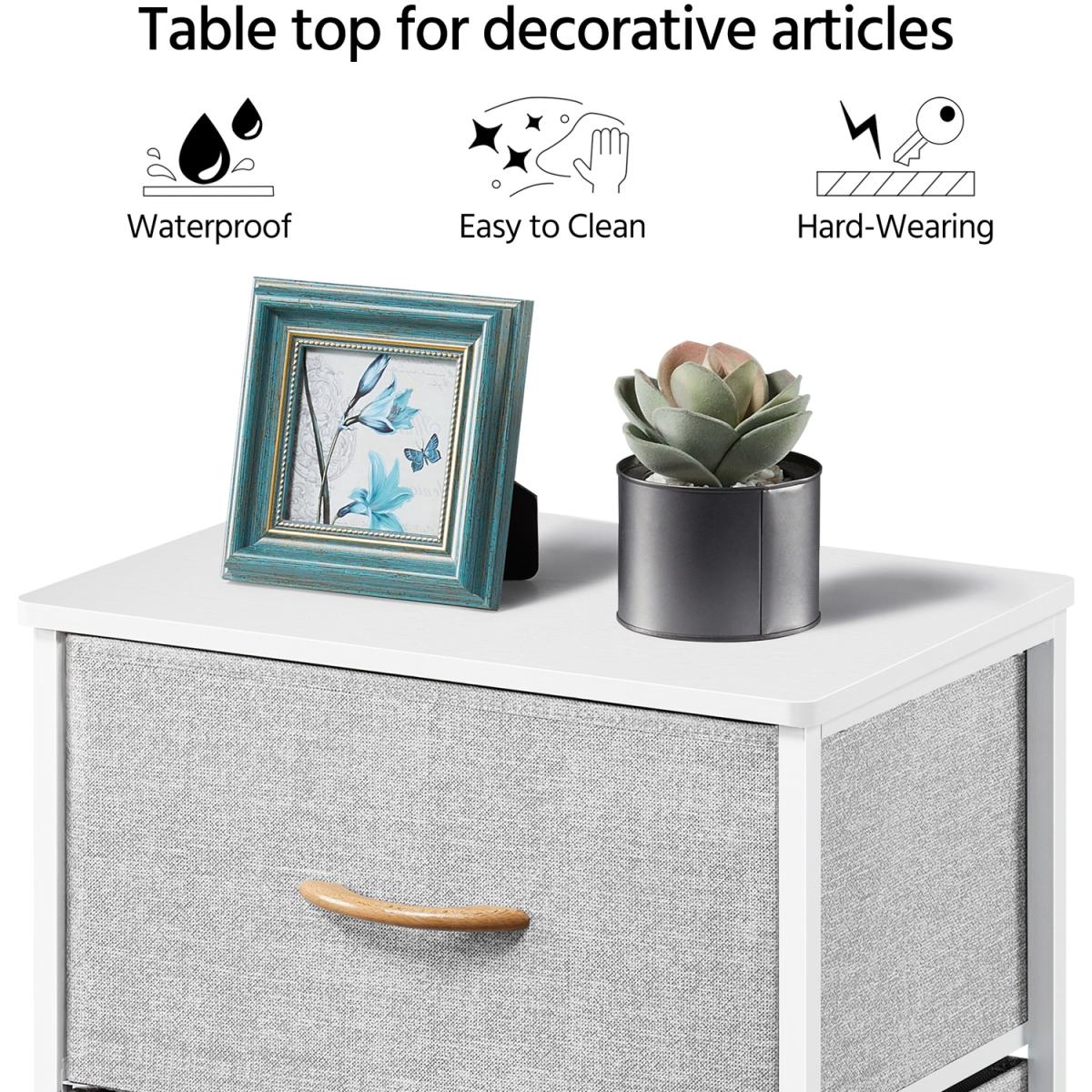 Made of a strong iron frame, harmless wooden tabletop, and breathable non-woven fabric, this vertical storage tower is thoughtfully designed to combine function and beauty. The side table comes with 2 fabric drawers, which provides plenty of storage space for you. More, the drawer of soft fabric surface won't damage your items. The lightweight construction makes it a good addition to your living room, office, entryway, and other small spaces. The maintenance will be super easy wipe clean with a damp cloth and allow to air dry.