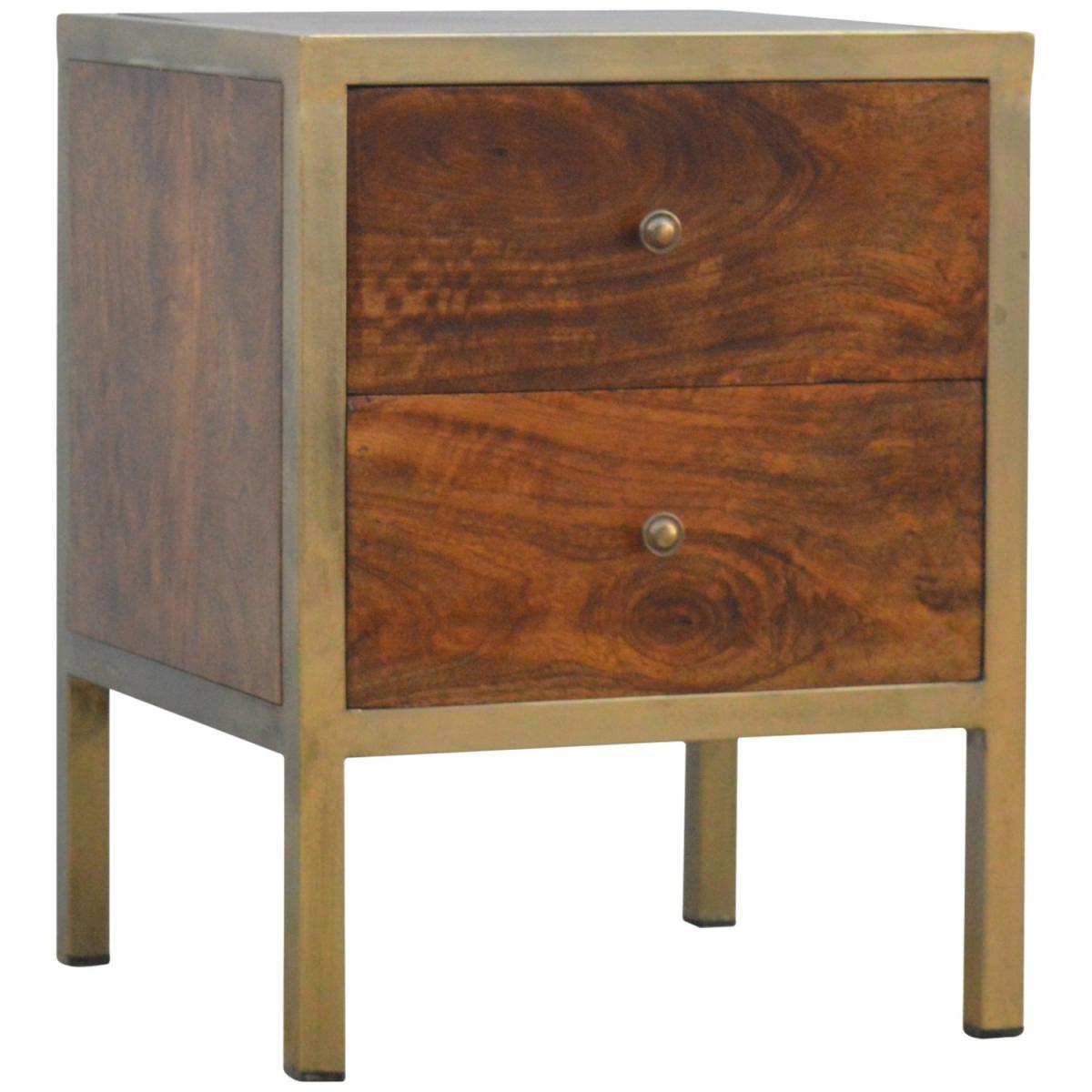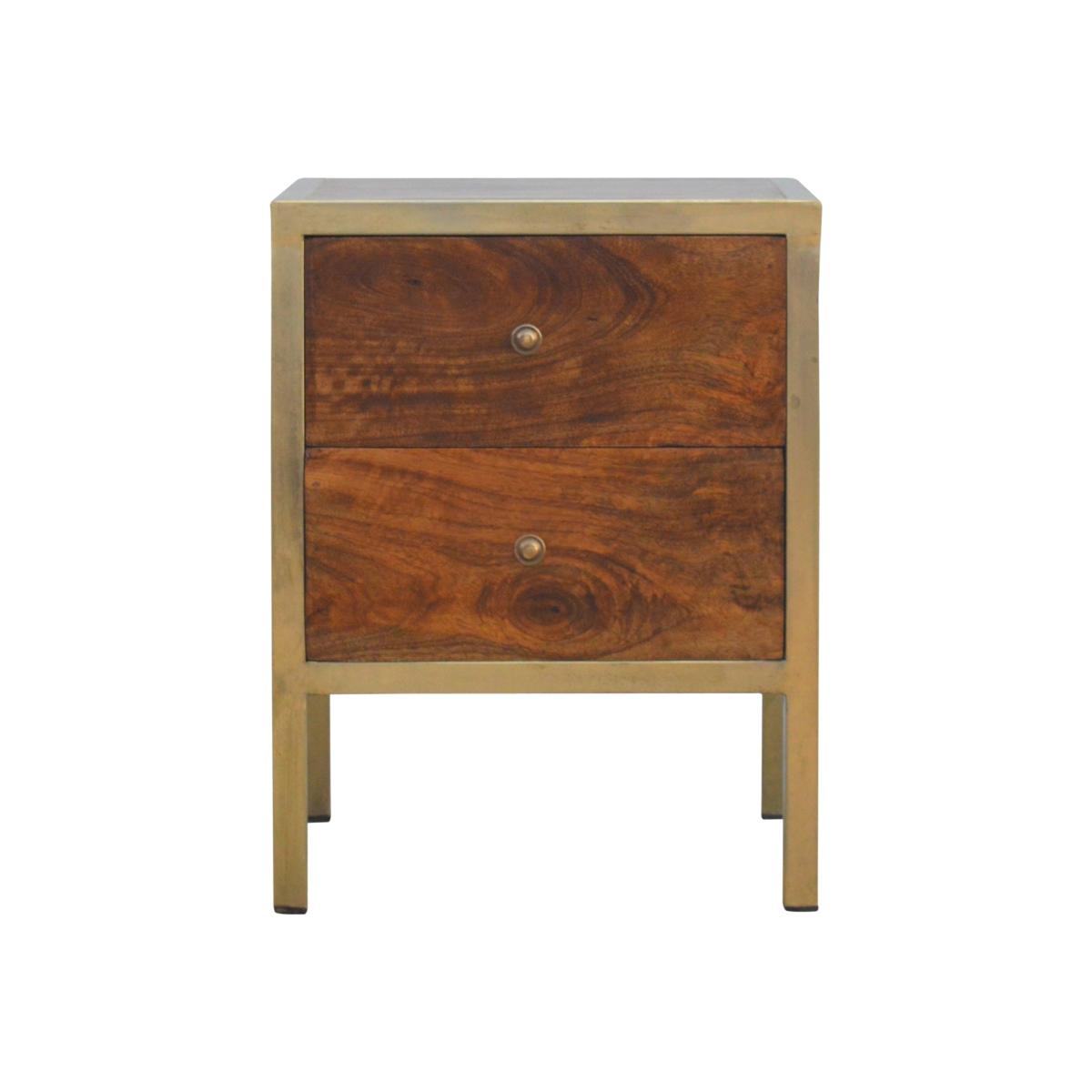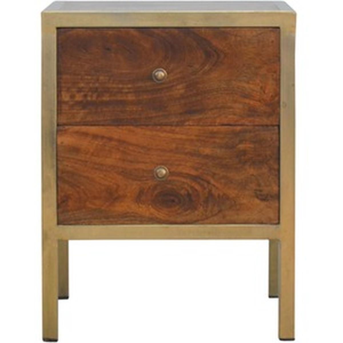 Enjoy the minimalistic design of this bedside constructed in solid Mango wood, with an iron frame in a beautiful gold brass finish and 2 drawers in a chestnut finish to take care of everyday utility items. This bedside table will add a definite and lasting character to your bed or living room.