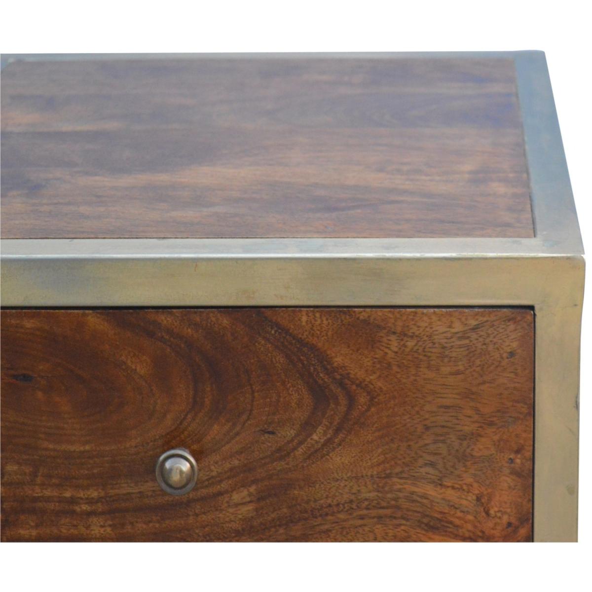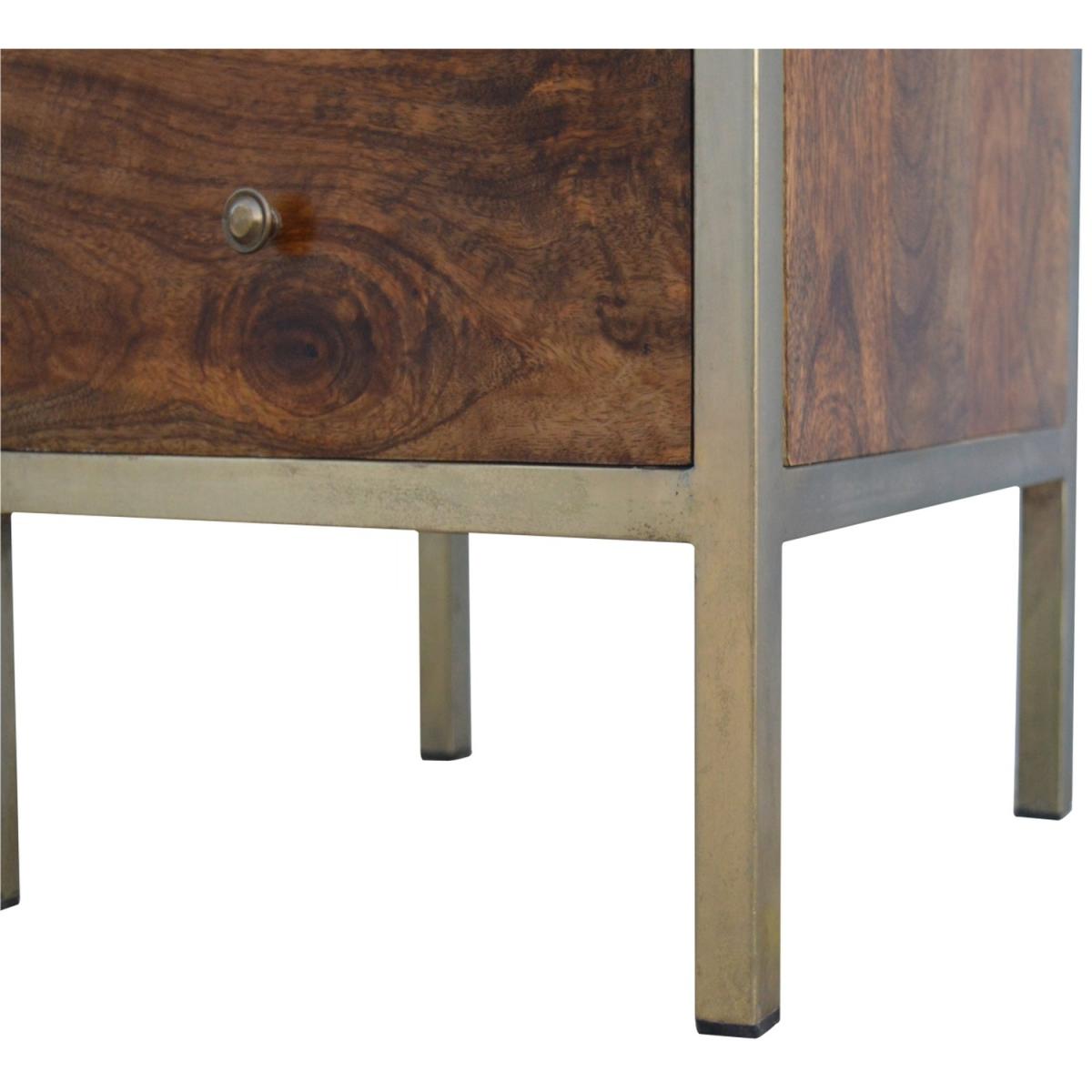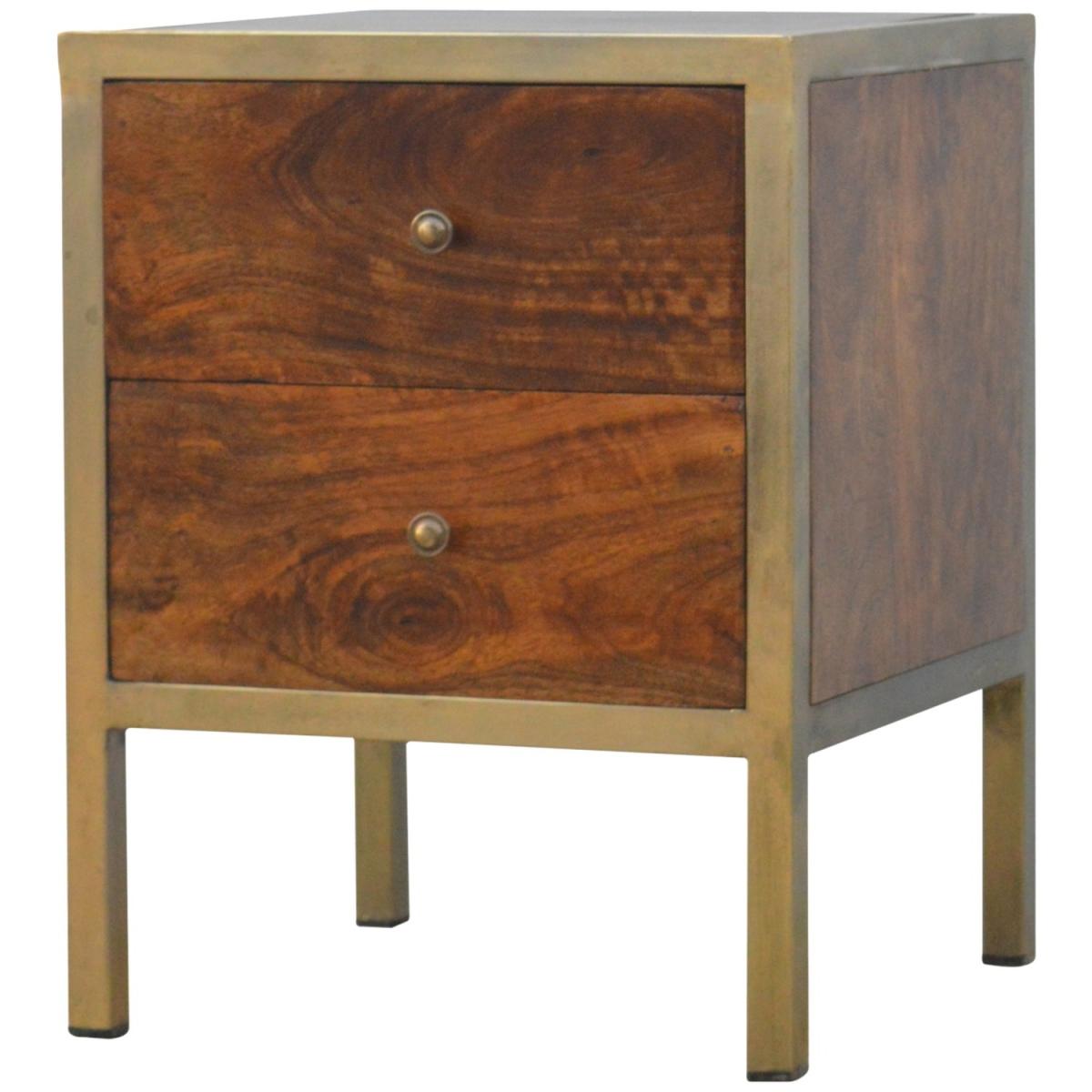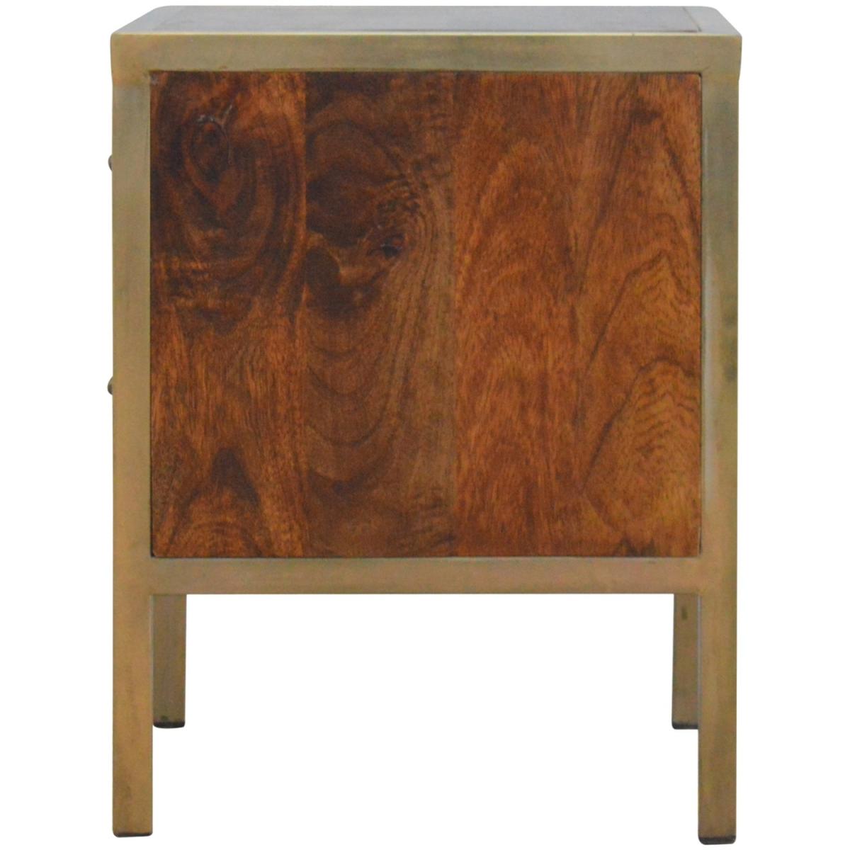 Enjoy the minimalistic design of this bedside constructed in solid Mango wood, with an iron frame in a beautiful gold brass finish and 2 drawers in a chestnut finish to take care of everyday utility items. This bedside table will add a definite and lasting character to your bed or living room.