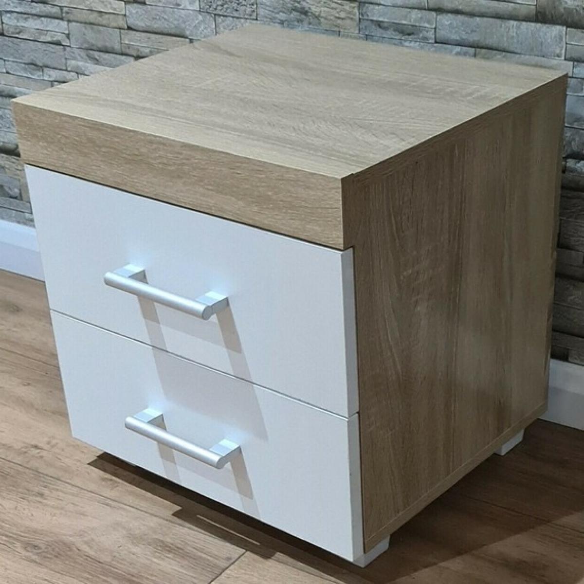 Sonoma oak effect bedside cabinet with two white front drawers. Modern and Elegant Appearance:The whole is Sonoma oak and the drawers are white. The bedside cabinet has 2 smooth, easy-glide drawers which run on metal runners and are finished with metal silver-colored handles and white plastic feet. Comes flat packed and just needs simple home assembly, all the tools are included.