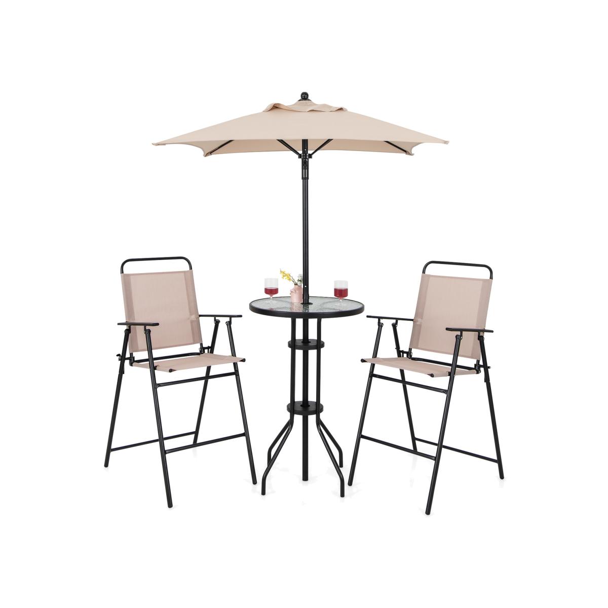 Enhance your outdoor space effortlessly with our all-inclusive patio furniture set! Boasting a cool square umbrella that shields you from relentless sun rays while letting refreshing breezes flow through, it's a true summer essential. Crafted from robust, weather-resistant materials, this stunning set stands up to Mother Nature's whims, promising years of enjoyment on any occasion. 2 Folding Chairs with Bar Table and Umbrella - Beige