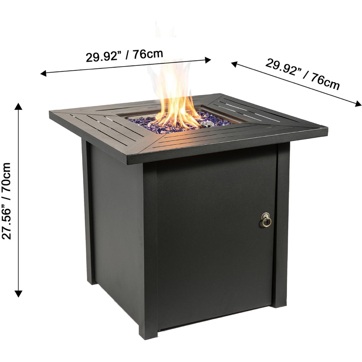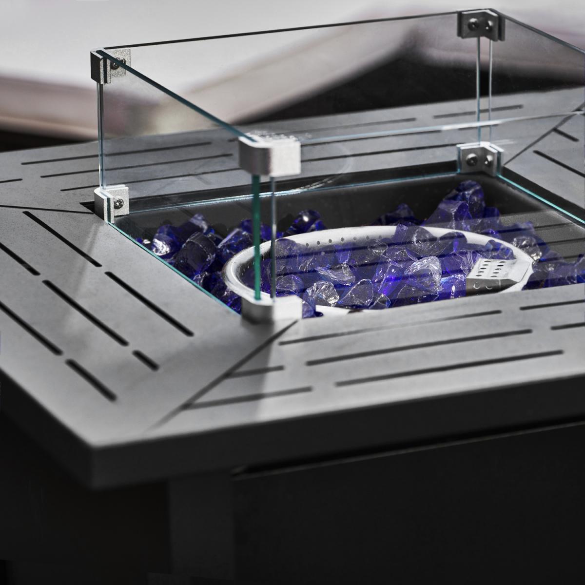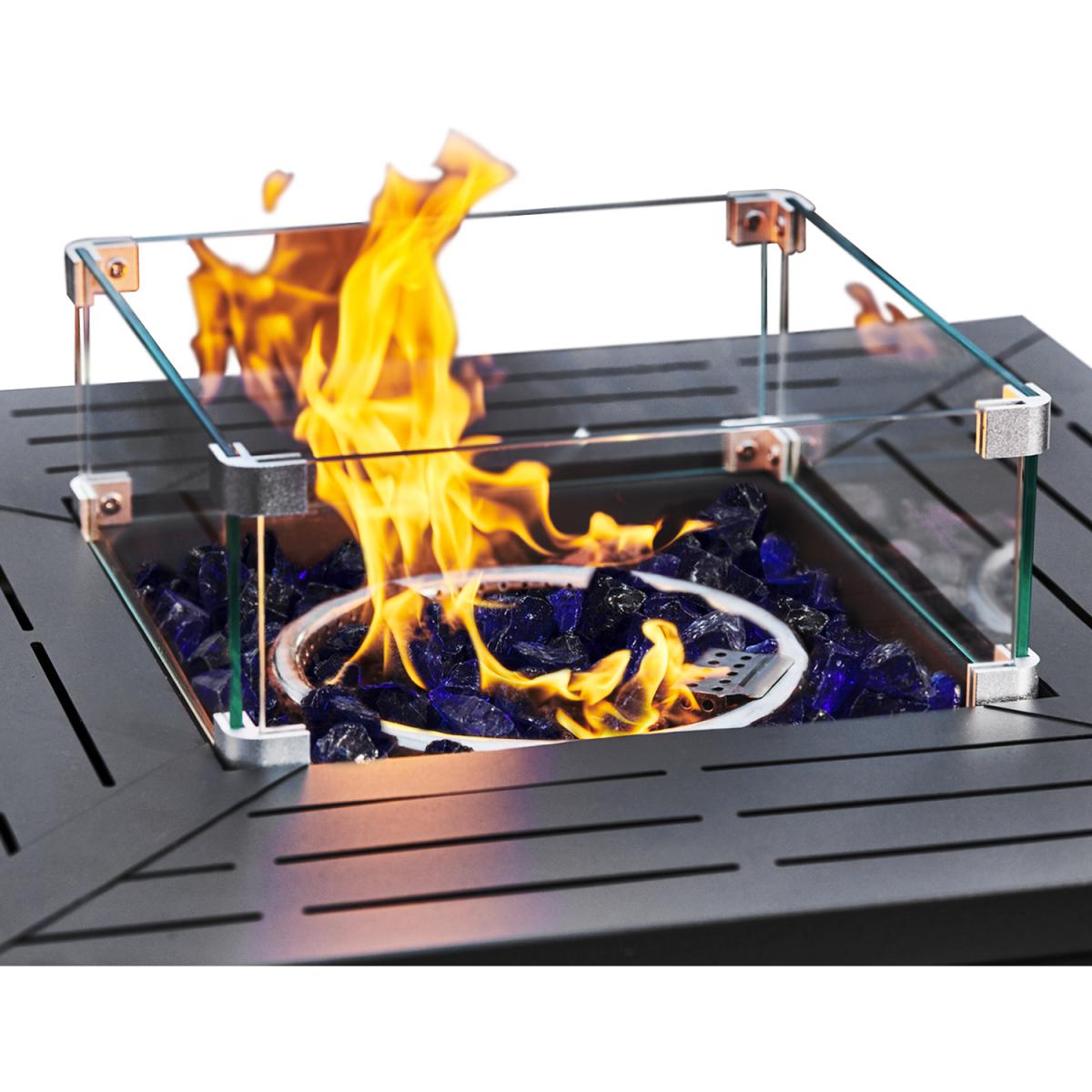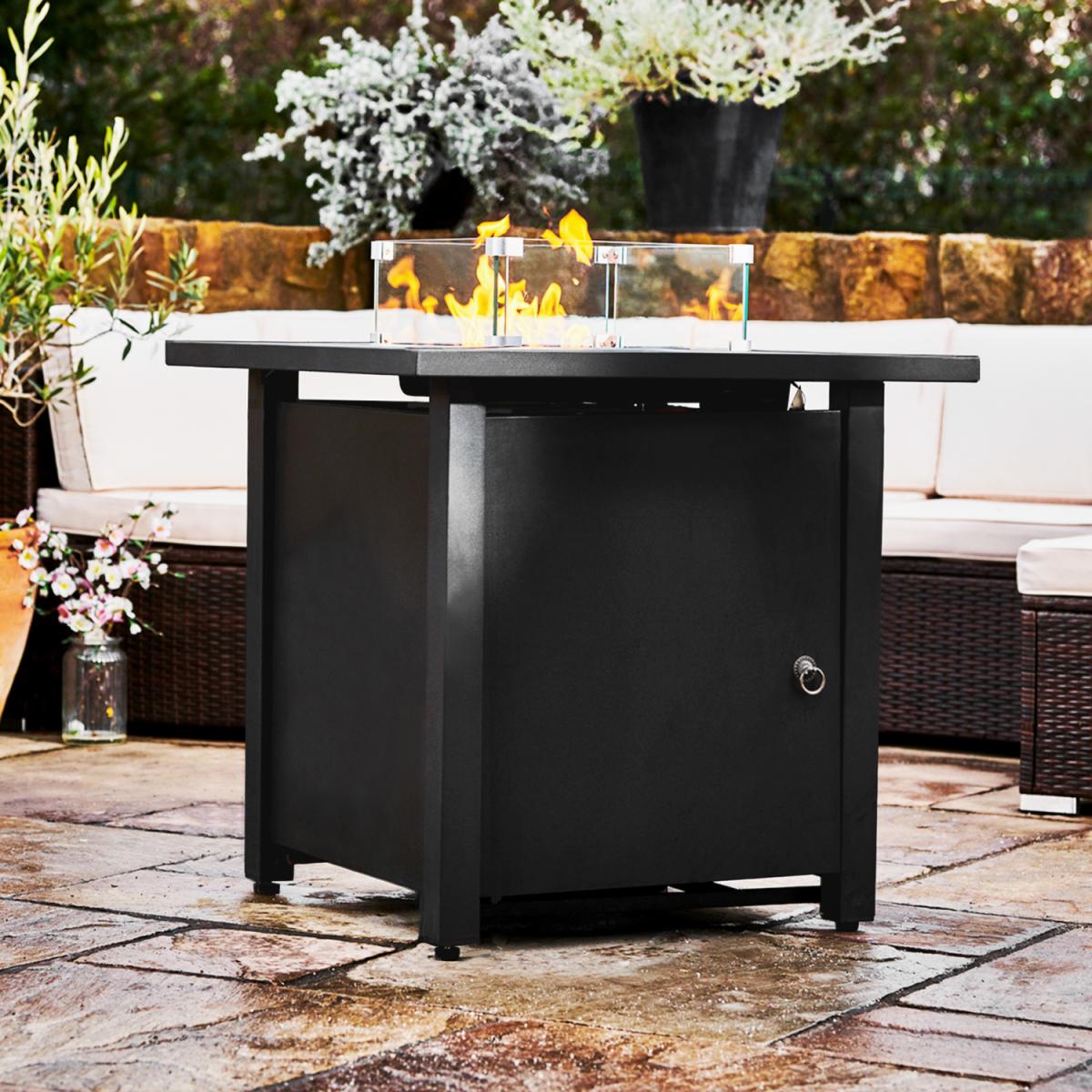 Enjoy the warm glow of a gas firepit with the Teamson Home rust-resistant steel square tall gas fire pit table or outdoor heater. The statuesque black firepit is sturdy, yet elegant and is a wonderful addition to any garden or patio furniture area. The gas fire pit is easy to use with any propane gas bottle source. This outdoor gas-burning fire pit comes with lava rocks and easy ignition for ease of use. It also comes with a glass windscreen to help with flame control and safety.
