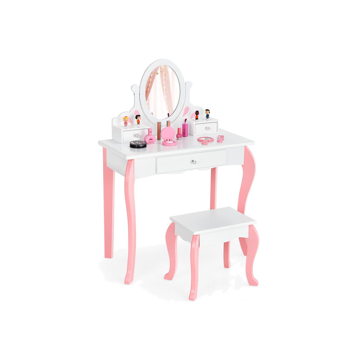 Our child-friendly vanity table set is designed to inspire your little one's creativity and style. The rotating mirror provides a clear reflection for makeup and hair styling fun. Its dual-use functionality transforms it into a convenient writing desk, promoting play and activities. The set features a matching stable stool and 3 storage drawers to organize jewellery, cosmetics, and accessories. Safety is paramount with rounded corners and a shatterproof acrylic mirror, making it a secure and comfortable space for kids to enjoy.