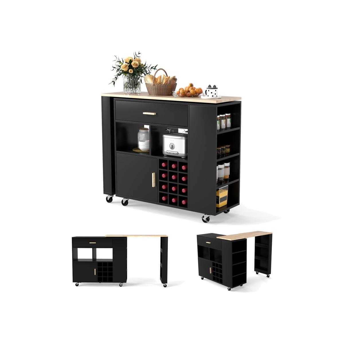 This 2-in-1 reversible kitchen island cart is a great way to transform your home, which can be served as a bar table when you rotate the tabletop. As you can see, the mobile serving cart features a wide rubber wood countertop to keep kitchen supplies you need within reach. The large drawer, 2 open shelves, storage cabinet and 4-tier side shelves are designed to hold a variety of kitchen essentials. Otherwise, a 3-position adjustable shelf suits kitchen supplies of different sizes. Come with a 12-bottle wine rack, you can store wine bottles or remove the partition to be a large storage shelf. 7 smooth-rolling casters (3 lockable) are convenient for moving the cart from the kitchen to the dining room. Not only be a kitchen storage cart but also can be used as a bar serving cart or food cart for the dining room. You can maximize its usage as per your preference.