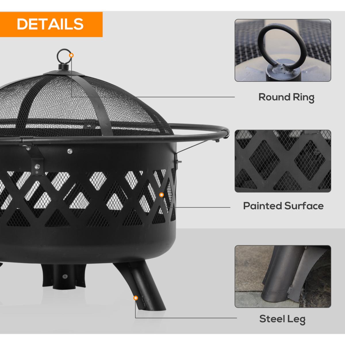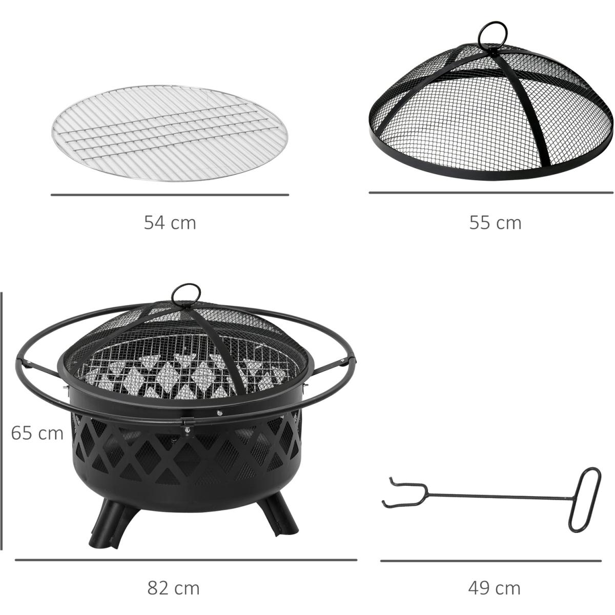 Bring warmth and ambience to your patio - whilst cooking delicious food with this Outsunny fire pit. The top mesh means you can hold food on there, whilst it's filled with burning fuel. You can then extend its use into the evening and night as it brings warmth to your outdoors - or even roast some marshmallows! The painted steel structure withstands up to 600degree for high cooking and warming temperature. Comes with mesh lid and fire poker.