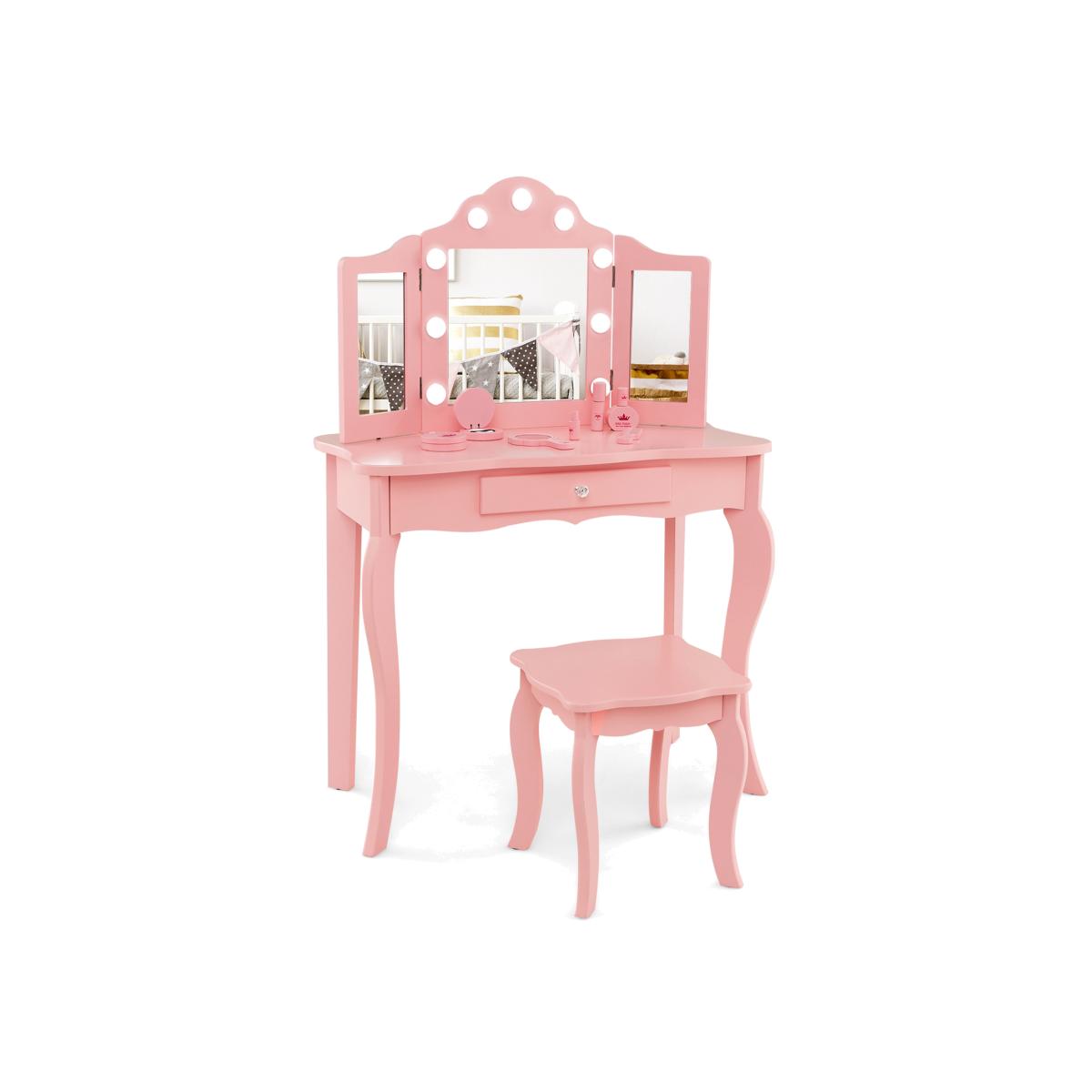 The vanity table is equipped with a tri-folding sliver mirror, which can be detached to use the table as a writing desk. And the center mirror is decorated with 3-color dimmable LED lights, which offers a realistic makeup experience. With the storage drawer under the tabletop, kids can store their small items well. For increased safety, this dressing table set can be attached to the wall with included anti-toppling device.