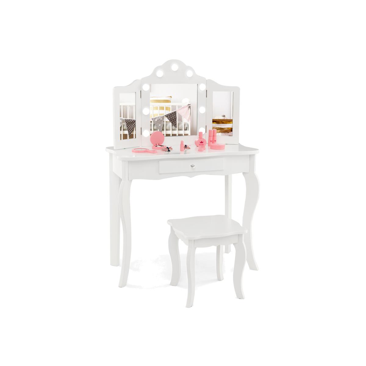 The vanity table is equipped with a tri-folding sliver mirror, which can be detached to use the table as a writing desk. And the center mirror is decorated with 3-color dimmable LED lights, which offers a realistic makeup experience. With the storage drawer under the tabletop, kids can store their small items well. For increased safety, this dressing table set can be attached to the wall with included anti-toppling device.
