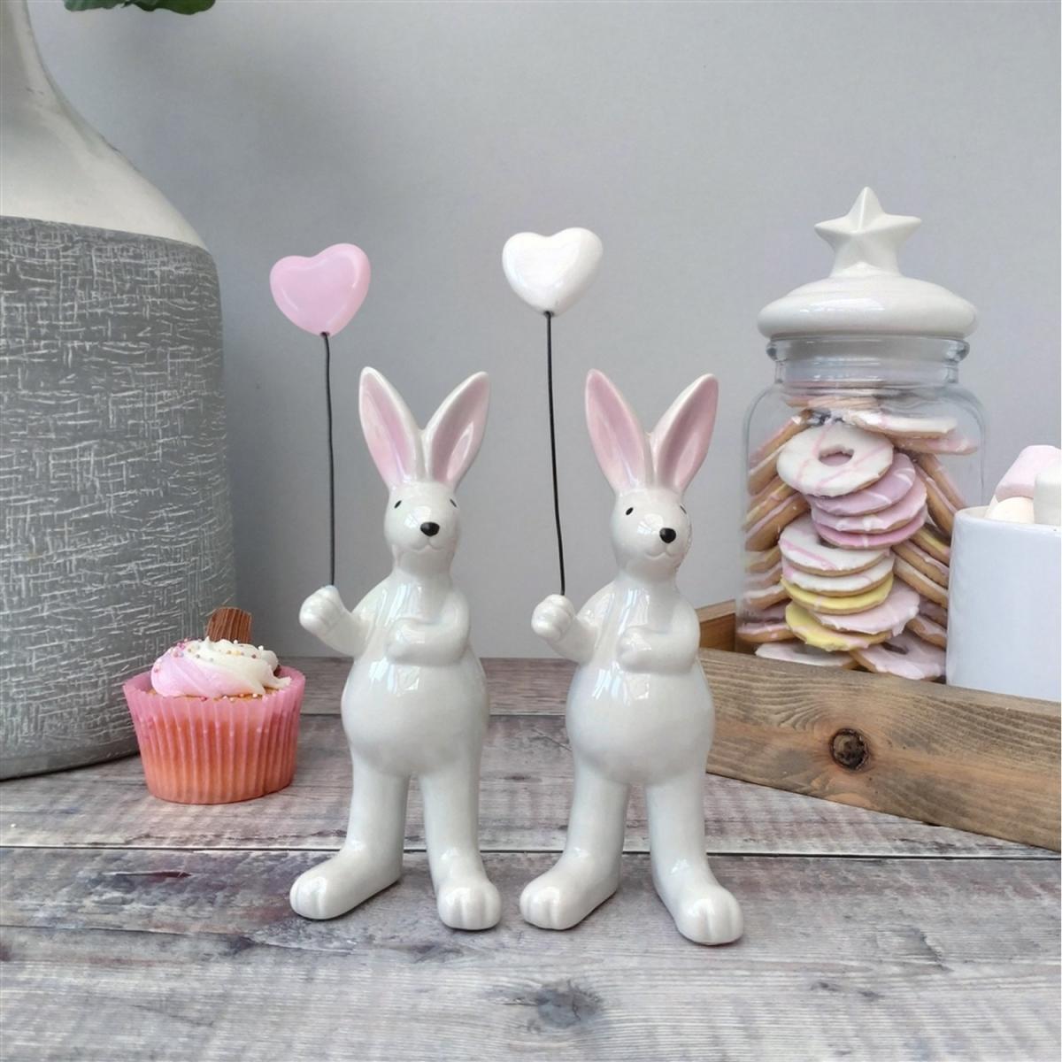 2 Large Ceramic Rabbit Ornament With Heart Balloon - White