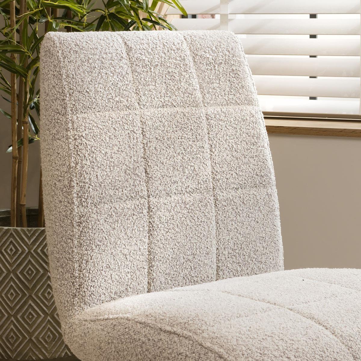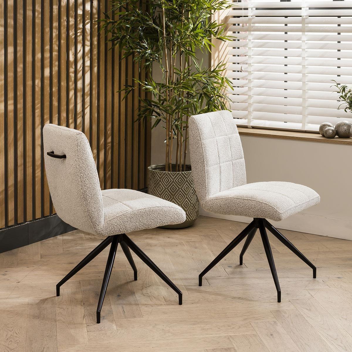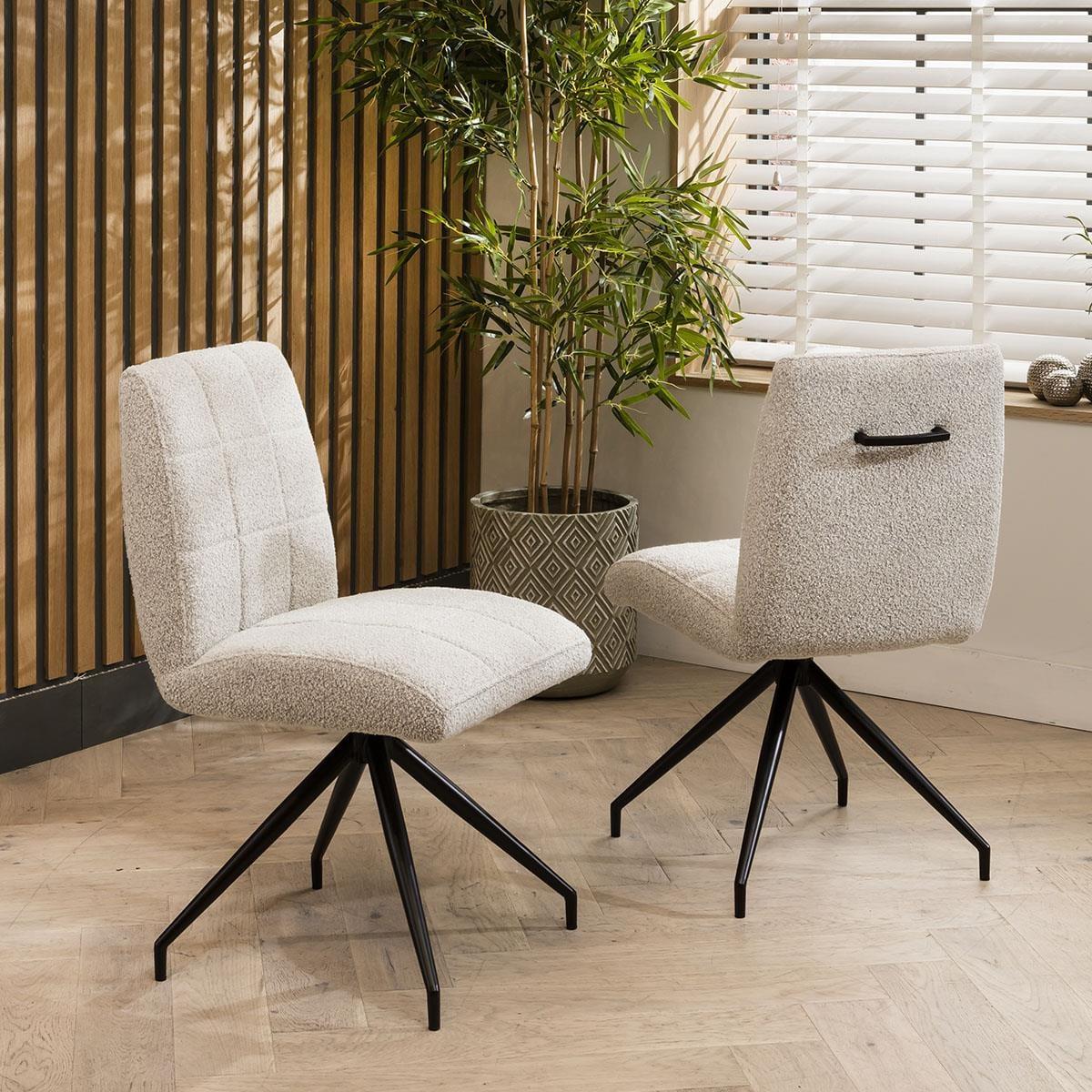 Upholstered in smoke grey boucle fabric, with a simple yet elegant design, this set of 2 modern swivel dining chairs will elevate your dining room. The seat and backrest feature line stitch detailing, along with a sleek black metal handle on the back, making these chairs perfect for those seeking style and convenience. Designed for both style and comfort, The Laurel dining chairs are perfect for any modern kitchen table. The premium smoke grey boucle fabric not only adds a touch of luxury but also ensures a comfortable seating experience. The line stitch detailing on the seat and backrest adds a subtle elegance, making these chairs a stunning addition to any dining space. Equipped with a swivel base, these dining chairs offer flexibility and ease of movement, allowing you to effortlessly engage in conversations around the table. The 4 point base provides stability and durability, ensuring these chairs will stand the test of time while maintaining their stylish appeal. Assembly is quick and hassle-free simply attach the seat to the base, and you're ready to enjoy these modern dining chairs. W48cm D58cm H86cm Seat D49cm H44cm Set of 2 Grey Boucle Dining Chairs