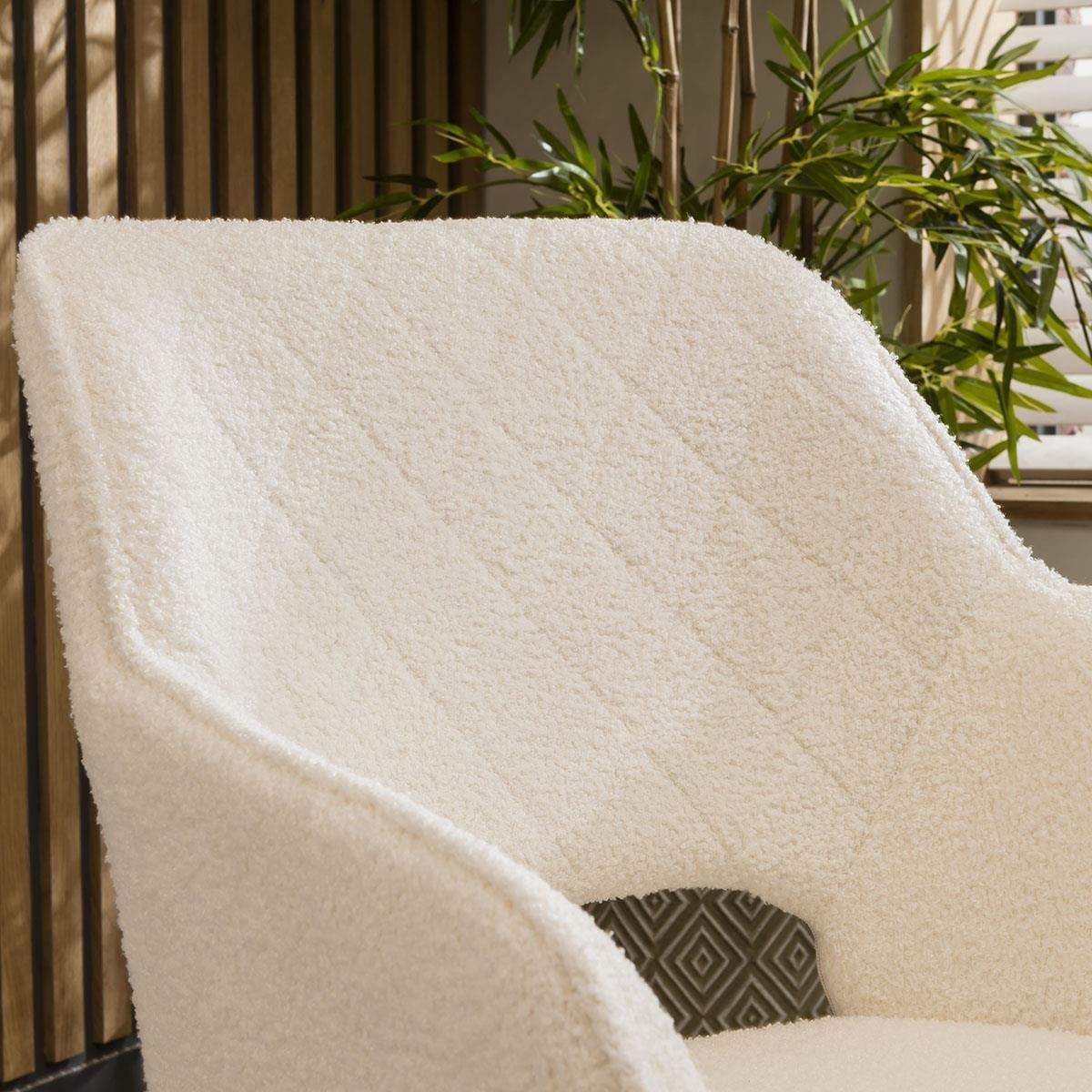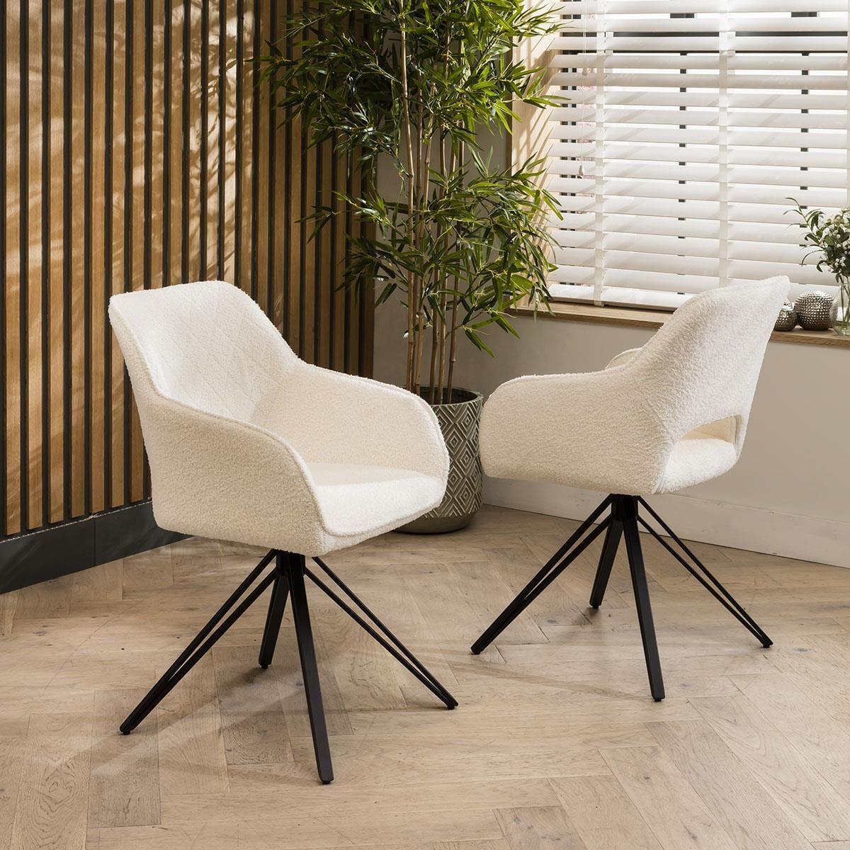 The Lincoln modern kitchen table chairs boast clean lines with diamond quilted detailing on the backrest. The swivel base, coupled with a black metal 4 point leg design, ensures both style and stability. Featuring a modern carver style design with arms, the dining chairs are upholstered in premium white boucle fabric. Crafted for comfort and style, the seats of the Lincoln luxury dining chairs are upholstered in plush premium white boucle fabric, offering a cosy yet chic seating experience. The carver style design with arms provides extra support and a touch of refinement, making these chairs perfect for long dinners or casual gatherings. The swivel base of these modern dining chairs adds functionality and versatility to your dining space. Effortlessly rotate to engage in conversations or reach for items around the table while maintaining comfort and stability. The sleek black metal 4 point base complements the modern design, enhancing both style and durability. Assembly is a breeze with these boucle dining chairs. Simply attach the seat to the base, and you're ready to enjoy your stylish new seating arrangement. W56cm D59cm H87cm Seat W42cm D45cm H50cm Set of 2 White Boucle Dining Chairs
