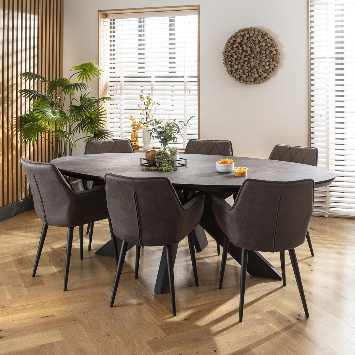 This set of 2 luxury dining chairs feature a modern shape and high arms for added stability. These grey dining chairs, adorned with line stitching detail, are upholstered in premium dark grey fabric. Crafted with premium built quality, they stand on sturdy metal legs with a sleek black powder coating. Our Mia carver dining chairs with arms showcase a contemporary silhouette, blending seamlessly with various decor styles. The modern shape and elegant rhombus stitching detail add a touch of sophistication, making these dining room chairs a perfect addition to any kitchen or dining area. Experience the ultimate comfort with our fabric dining chairs, upholstered in high-quality dark grey fabric. This premium material not only ensures durability but also provides a soft and luxurious feel, enhancing your dining experience with both style and comfort. These modern dining chairs feature robust metal legs with a black powder coating, offering exceptional stability and support. The sleek design of the legs complements the overall aesthetic, making these grey dining chairs a durable and stylish choice for any dining space. W85cm D58cm H62cm Seat Height 50cm Arm Height 67cm Set of 2 Modern Grey Fabric Dining Chairs