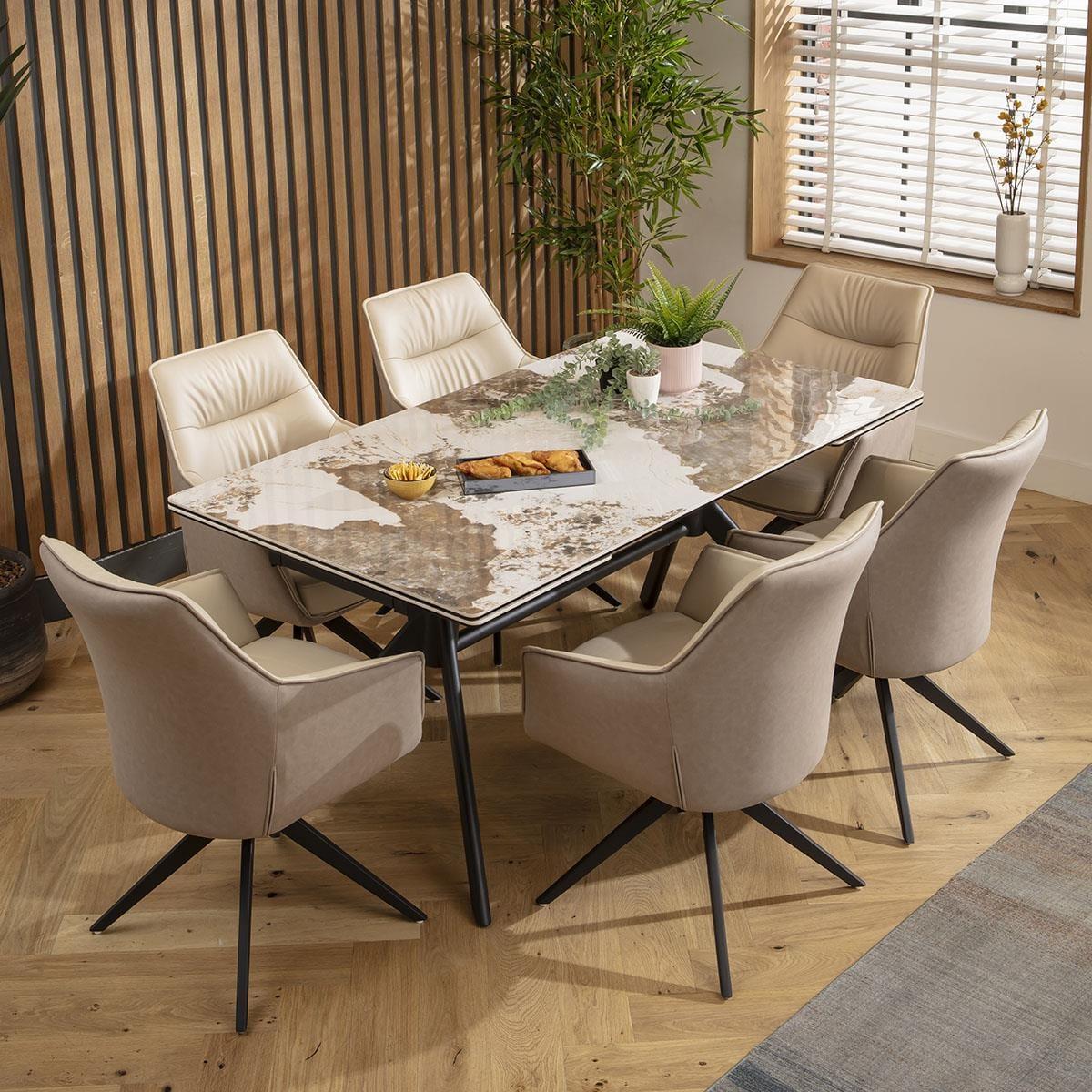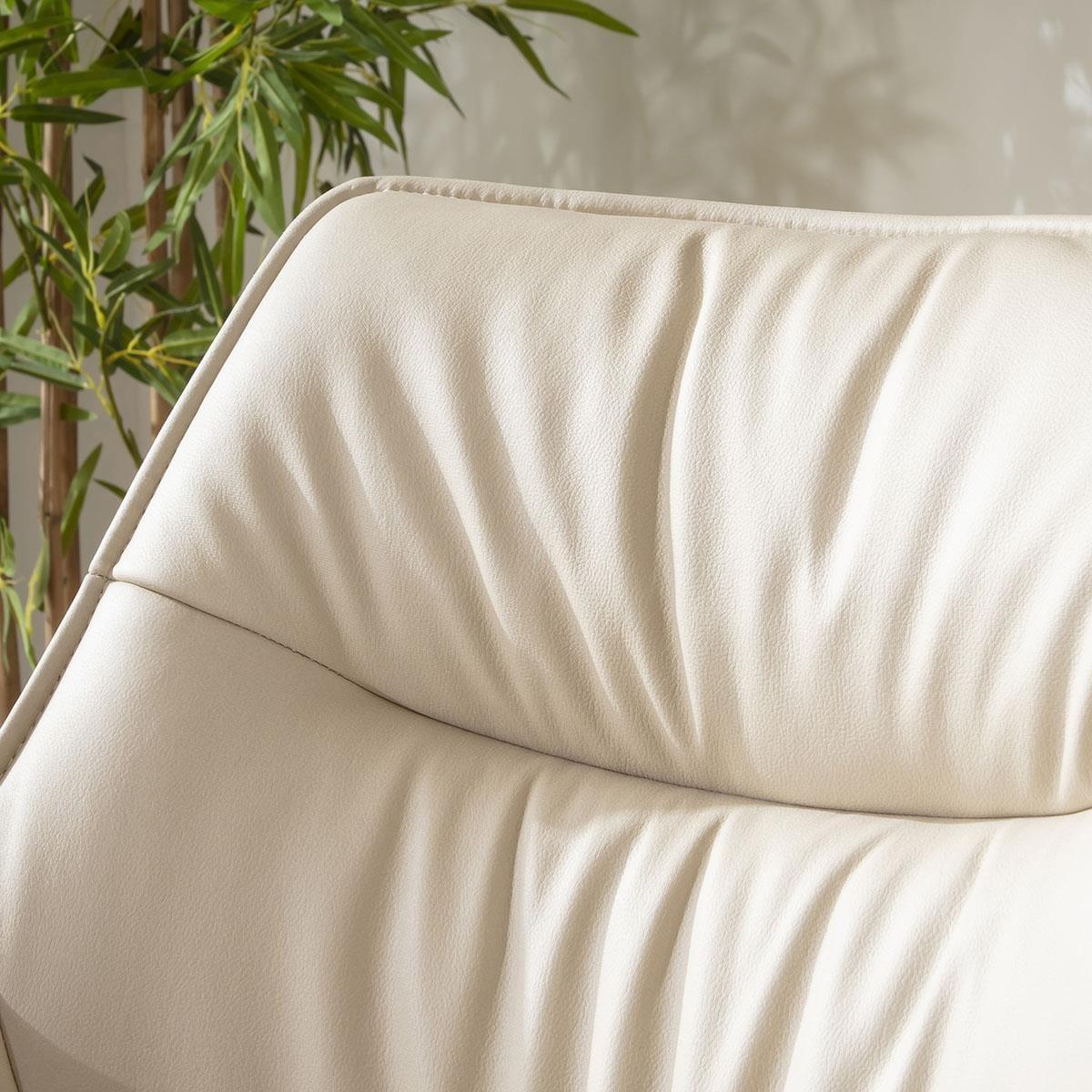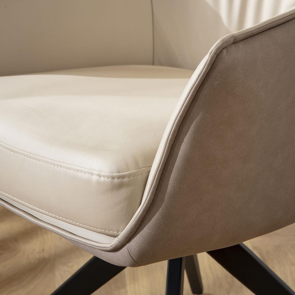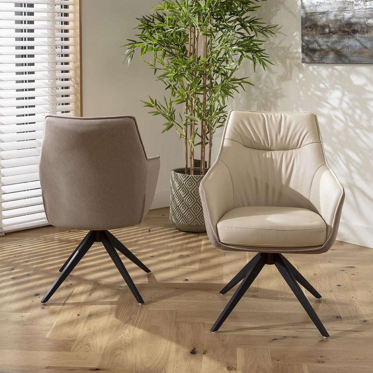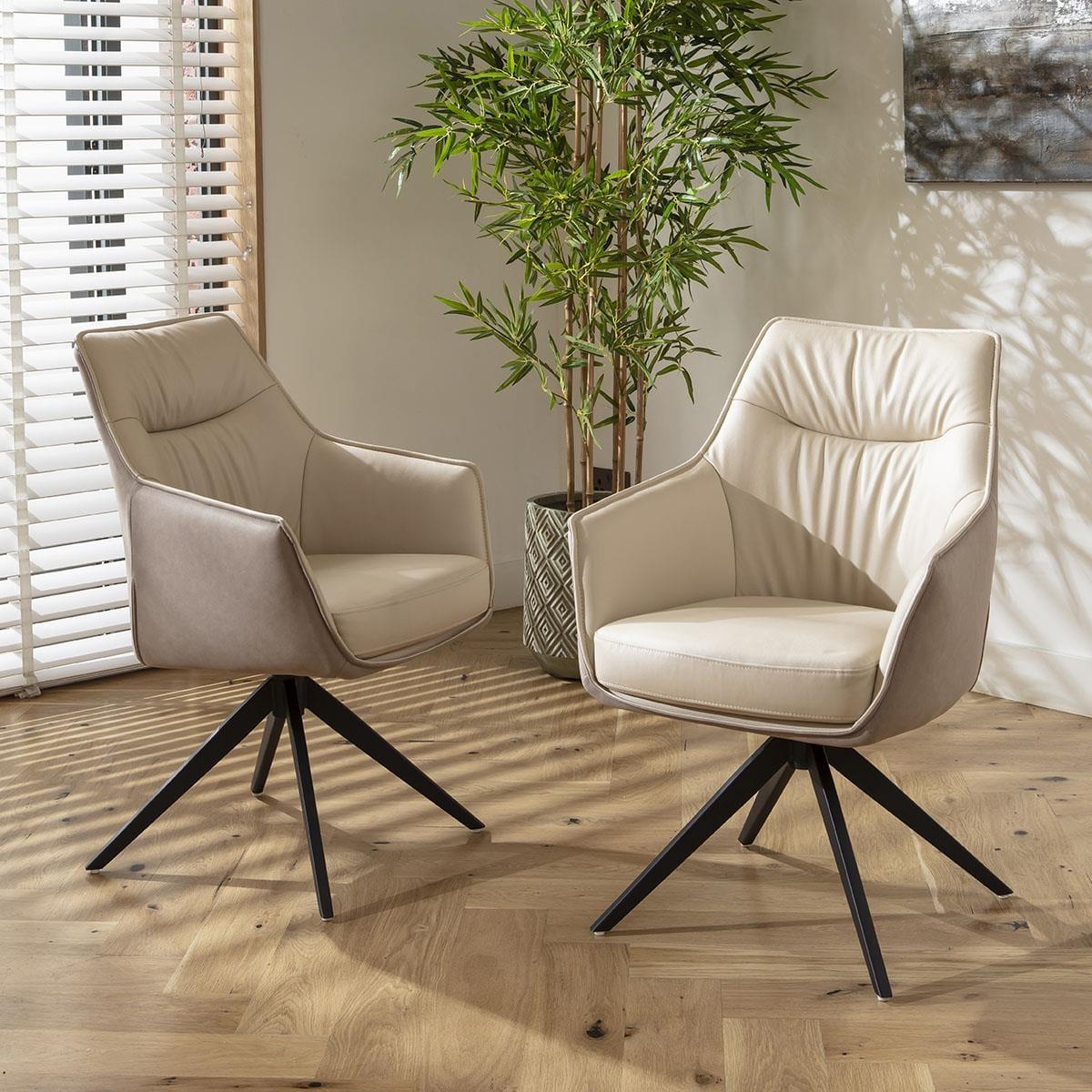 This set of 2 carver dining chairs with arms are a sophisticated addition for sleek dining spaces. The cream faux leather dining chairs feature a bold design and premium materials, including beige fabric outers and a rotating swivel base - making them a standout choice among modern swivel dining chairs. Crafted with a focus on premium build quality, the Millie carver dining chairs boast a modern silhouette complemented by a black powder-coated 4-point base. The chair features a 180-degree rotating seat with an auto-return function, ensuring the chair always returns to its original position. Excellent support and stability, combined with premium cushioning in the seat, ensures optimal comfort. This modern dining chair with arms features a luxurious combination of materials and colours. The inside seat part is covered in an elegant cream faux leather, which is not only stylish but also easy to clean. The outer chair is wrapped in a premium beige fabric, adding a touch of elegance to your dining room. The blend of cream leather and premium fabric creates a visually appealing contrast. Assembling your new dining room chair is straightforward and hassle-free. The chair's base needs to be attached to the seat part, a simple process that ensures the chair is secure and ready for use. With clear instructions and minimal tools required, you'll have your new swivel kitchen chairs ready in no time, enhancing your dining experience with both style and functionality. W85cm D61cm H64cm Seat Height 49cm Set of 2 Dining Chairs with Faux Leather Seat & Swivel Base
