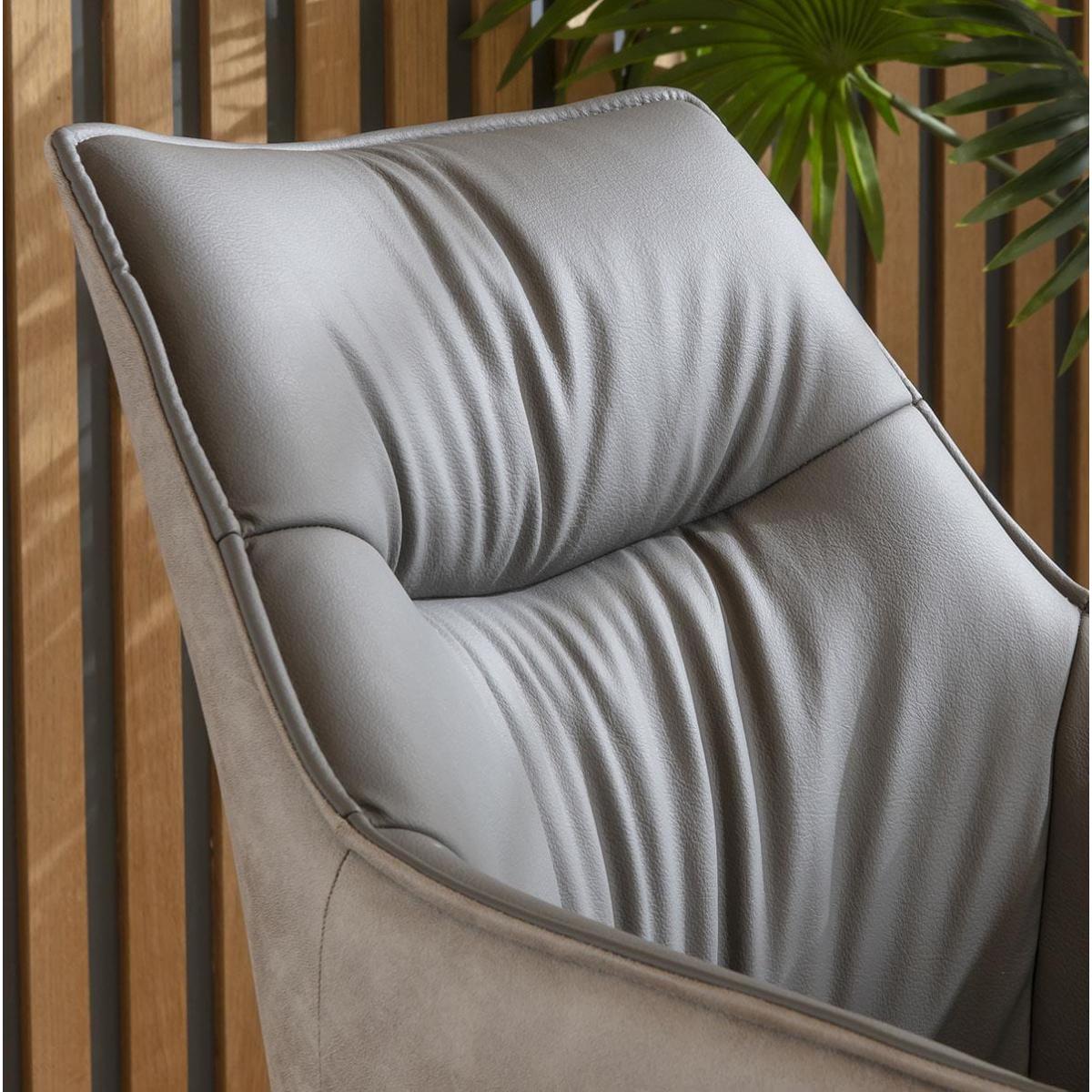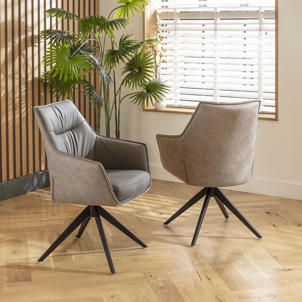 This set of 2 carver dining chairs with arms are a sophisticated addition for sleek dining spaces. The grey faux leather dining chairs feature a bold design and premium materials, including grey fabric outers and a rotating swivel base - making them a standout choice among modern swivel dining chairs. Crafted with a focus on premium build quality, the Millie carver dining chairs boast a modern silhouette complemented by a black powder-coated 4-point base. The chair features a 180-degree rotating seat with an auto-return function, ensuring the chair always returns to its original position. Excellent support and stability, combined with premium cushioning in the seat, ensures optimal comfort. This modern dining chair with arms features a luxurious combination of materials and colours. The inside seat part is covered in an elegant grey faux leather, which is not only stylish but also easy to clean. The outer chair is wrapped in a premium grey fabric, adding a touch of elegance to your dining room. Assembling your new dining room chair is straightforward and hassle-free. The chair's base needs to be attached to the seat part, a simple process that ensures the chair is secure and ready for use. With clear instructions and minimal tools required, you'll have your new swivel kitchen chairs ready in no time, enhancing your dining experience with both style and functionality. W85cm D61cm H64cm Seat Height 49cm Set of 2 Dining Chairs with Faux Leather Seat & Swivel Base