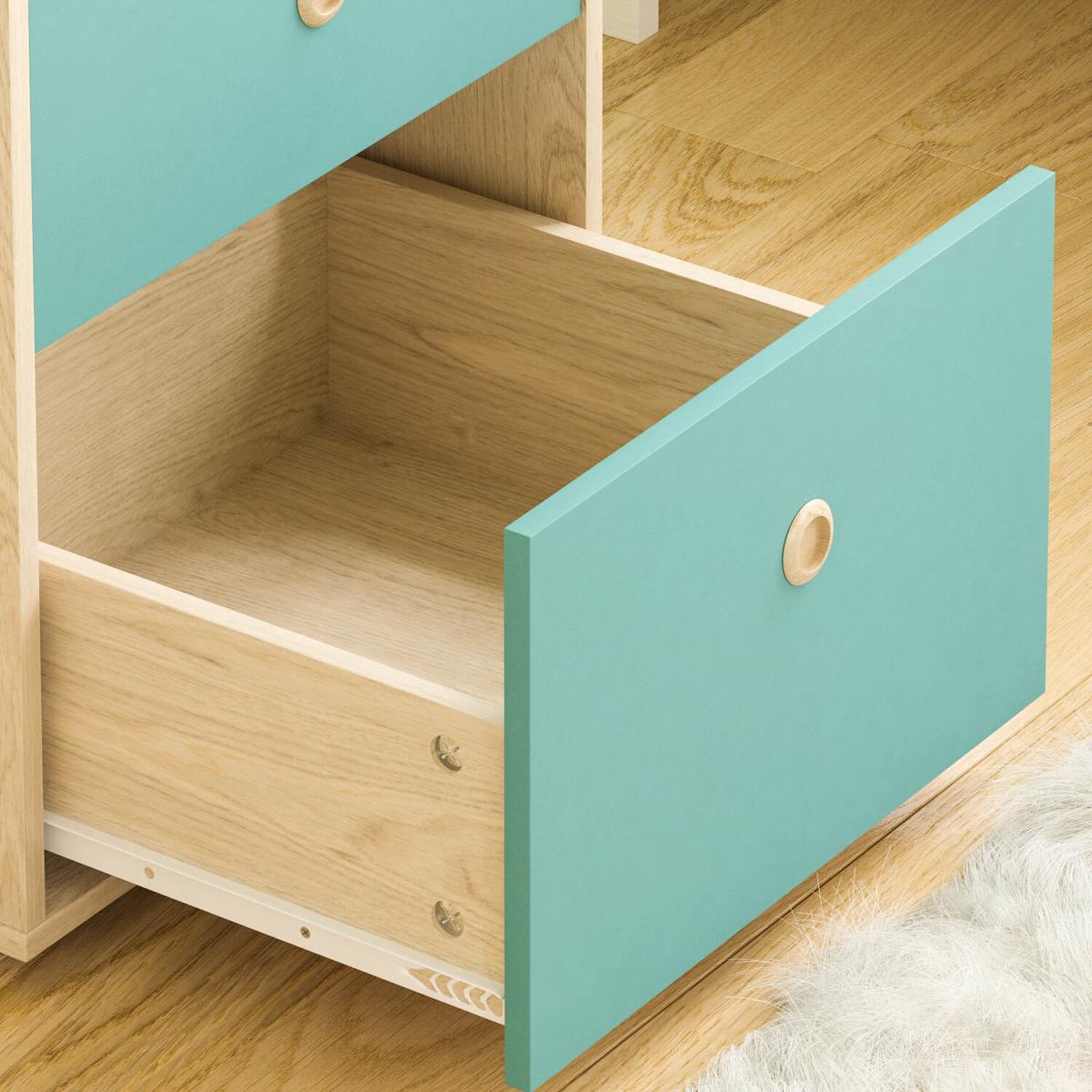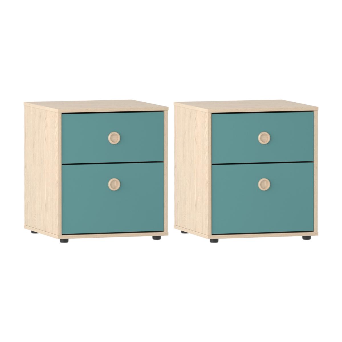 Made of quality materials, this set of bedside tables features coloured front panels and oak effect frame. To ensure bedtime rituals are consistent, this set provides a place where your little ones can keep glass of water, lamp and alarm, as well as beloved toys can wait for them in sliding drawers altogether with good-night-stories.