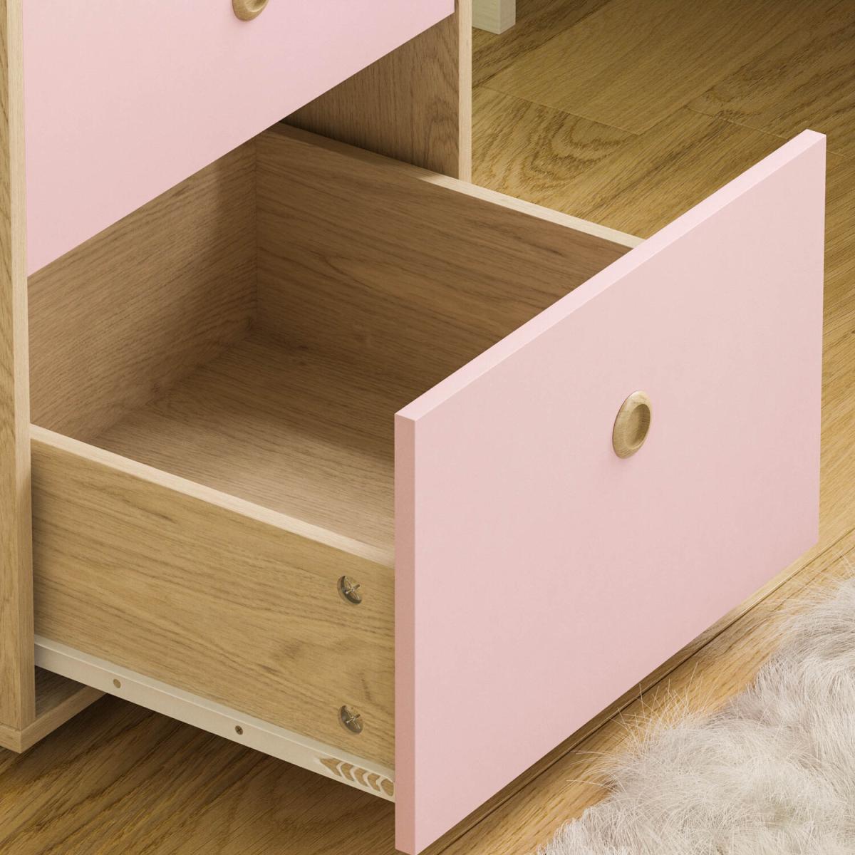 Made of quality materials, this set of bedside tables features coloured front panels and oak effect frame. To ensure bedtime rituals are consistent, this set provides a place where your little ones can keep glass of water, lamp and alarm, as well as beloved toys can wait for them in sliding drawers altogether with good-night-stories.