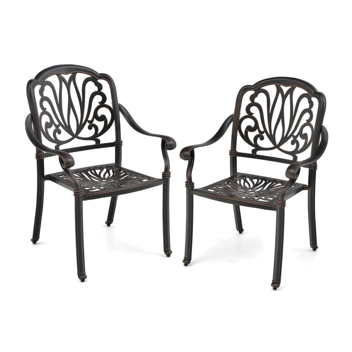 Complement your outdoor dining space with our cast aluminum patio chairs! After simple assembly, these outdoor dining chairs are ready to use. The backrests, armrests and seats are all curved, making you feel more comfortable. What's more, the rustproof and sturdy cast aluminum not only assures you higher durability but shows you 165 kg strong bearing capacity. After using them, just stack these patio armchairs together for space-saving. 2 Pack Cast Aluminum Patio Chairs - Bronze