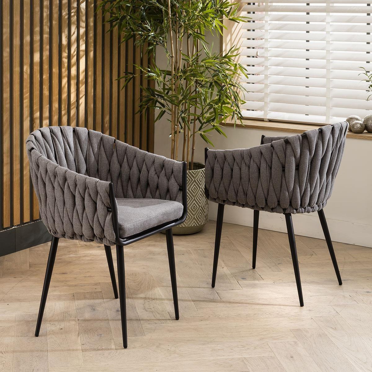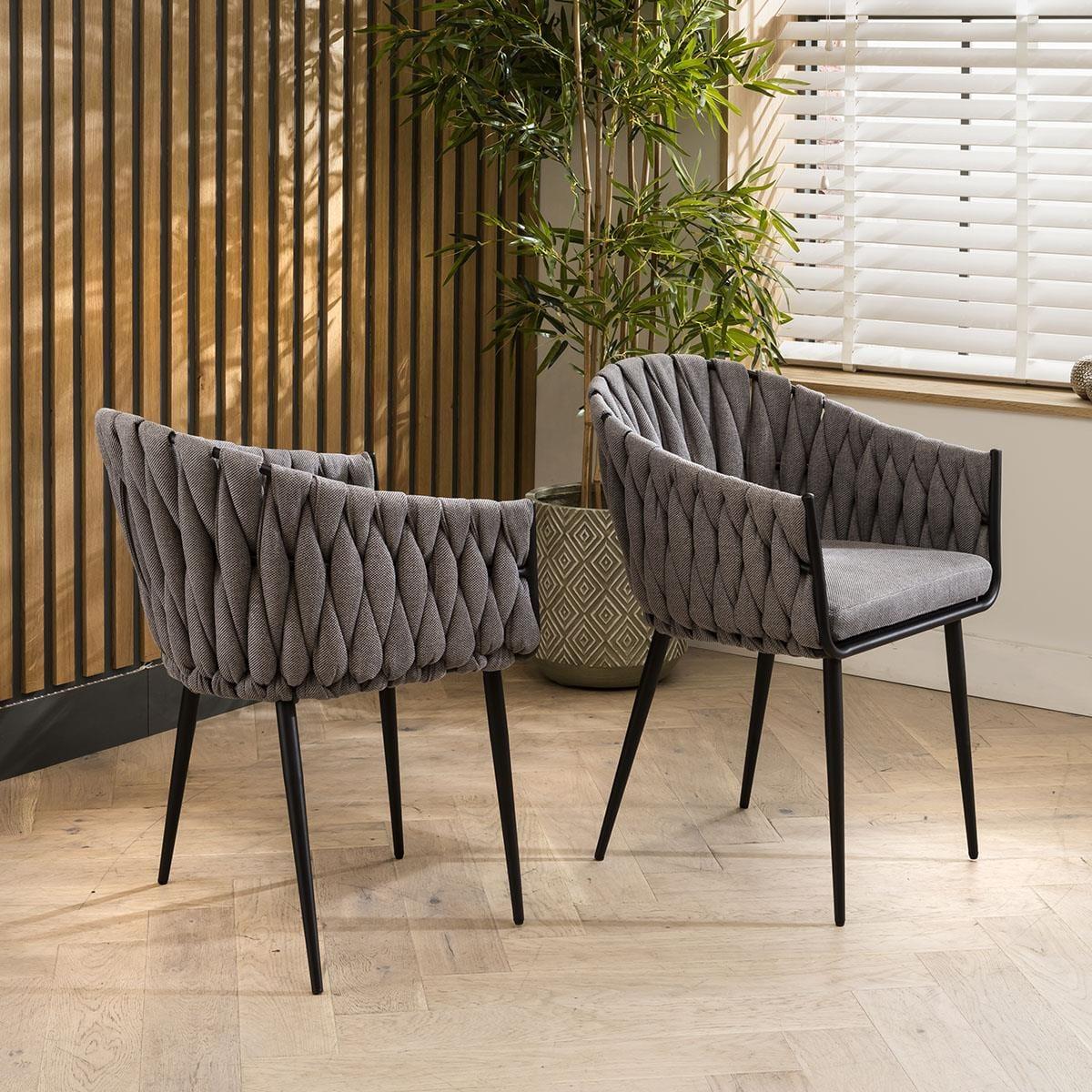 Our Pandora woven carver dining chairs with arms feature a unique design, boasting a wrap-around backrest intricately crafted with thick grey rope, and a luxury seat cushion upholstered in matching fabric. The dining chair frame, made from metal with a sleek black painted finish, offers stability on a 4-leg base. Designed for comfort, the seat of these modern kitchen table chairs is crafted to perfection. The wrap-around backrest provides ample support, while the thick grey braided rope adds a touch of elegance. With a luxury seat cushion upholstered in matching fabric, these chairs offer both style and comfort for extended dining experiences. Crafted with durability in mind, the chair frame of the Pandora dining chairs is constructed from sturdy metal. The black painted finish adds a contemporary touch, ensuring these chairs seamlessly integrate into any modern dining space. Available in a range of other colours, these modern dining chairs offer versatility to match any decor scheme. Whether you're looking to add a pop of color or stick to a monochromatic palette, these woven dining chairs are the perfect addition to elevate your dining area. W56cm D57cm H79cm Seat W44cm D45cm H50cm Leg assembly required