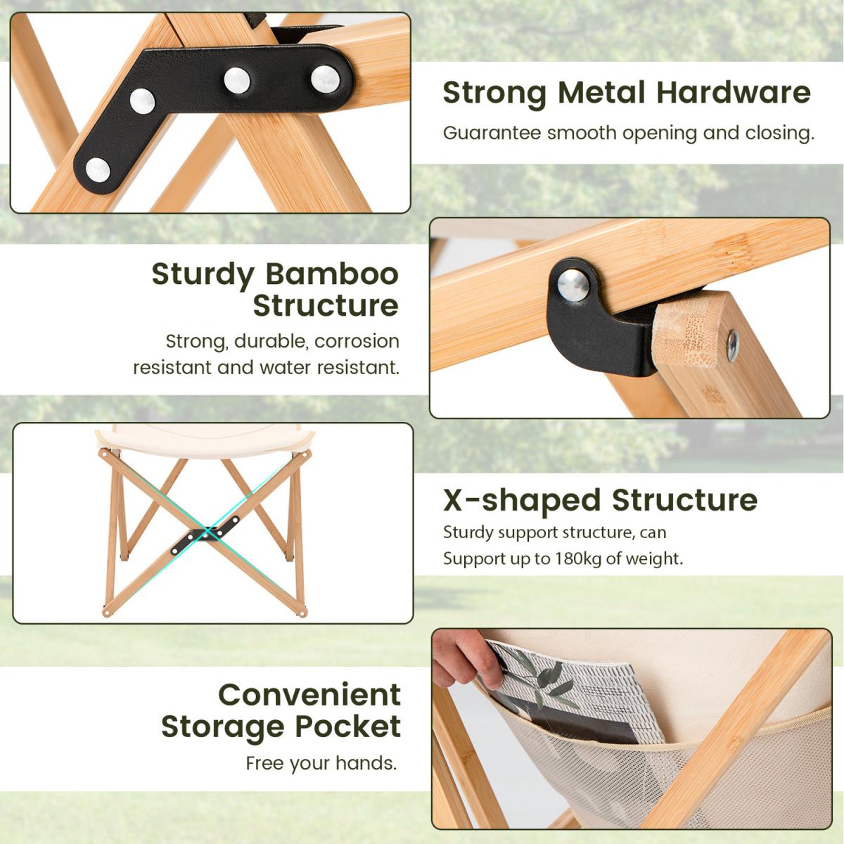 Enjoy a full day of leisure time outdoors with our butterfly chair! With an skin-friendly and breathable canvas fabric top, this chair will provide you with unlimited coziness, and the surface is also easy to clean with just a wet towel. Moreover, crafted from high quality bamboo, this water and corrosion resistant X structure can withstand 180kg of weight. Apart from that, the easy folding structure allows for an convenient storage and transportation, you can bring it with you in the back trunk or take it on the public transport for fishing, BBQ , camping, hiking. In addition, with the simple and modern outlook, this folding chair is the perfect addition to your outdoor relaxing space.