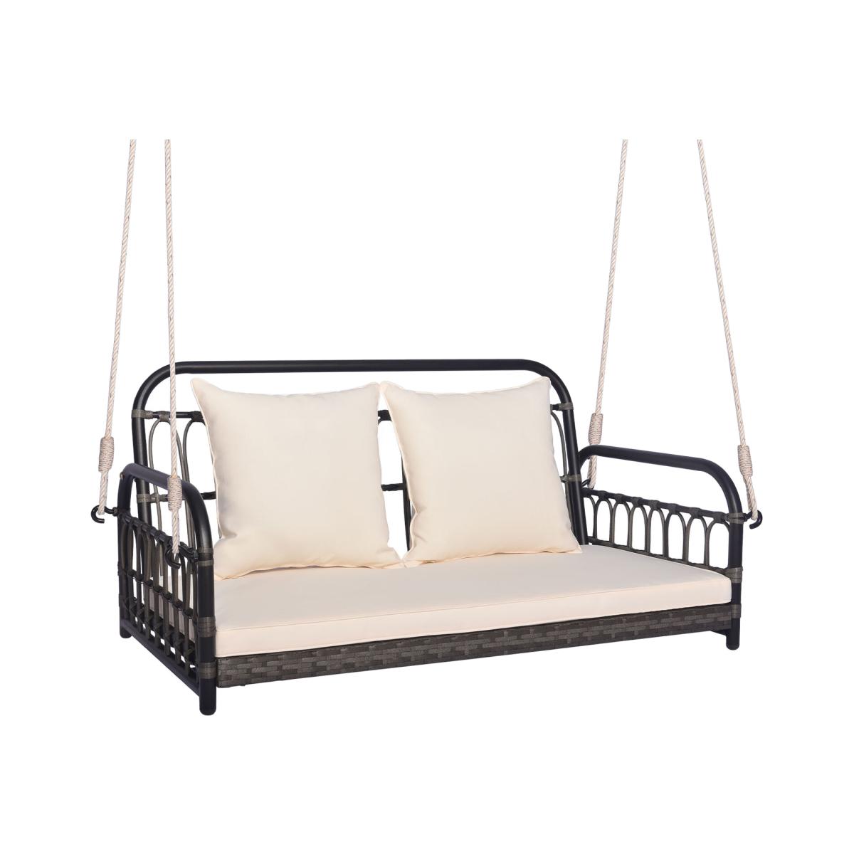 Infuse elegance into your outdoor spaces with this rope hanging chair. This hanging swing chair combines a weather-resistant wicker an a powder-coated metal frame to ensure years of outdoor enjoyment! With a stylish mix gray PE rattan design including soft back and seat cushions, you will love the experience of sitting in this restful porch bench.