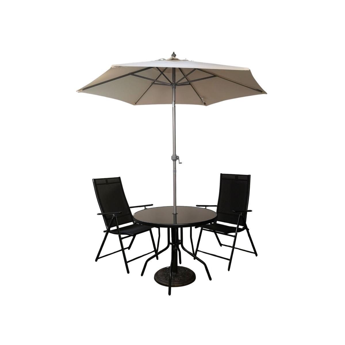 Relax and enjoy your leisure time this summer with this attractive glass top outdoor dining table and 2 chairs set with cream parasol and base. This stunning set will become the focal point to your garden, terrace or patio area making it ideal for dining on or just enjoying drinks in the summer sun and has space for up to 4 seats. Having an outdoor patio furniture set can greatly enhance your outdoor living space and creates a comfortable and inviting space for you to relax, entertain, and enjoy nature. The set includes a black, round tempered glass top table with 2 multi-position chairs, cream parasol and parasol base. Having a black steel set will blend seamlessly with its surroundings. It adds sophistication and a sleek, modern touch to your patio or garden. The frame of the table and chairs are made from steel and have been finished with a powder coating for added strength and durability. The chairs have a textilene backing and they can easily be folded away when not in use for easy and convenient storage. Choose from various positions to recline by adjusting the seat handles to sit back and unwind. With a parasol and base included you can shield yourself from the sun. The umbrella parasol is designed to provide ample coverage allowing you to stay cool, comfortable and protected in your outdoor space. This garden parasol offers a sleek and modern design with it's cream canopy and grey aluminium poles which will add that touch of sophistication to any outdoor setting. Wind the plastic crank handle to open and close the umbrella and the tilt function is activated by the press of a button. The cast iron effect parasol base has been made with strong resin materials that make a great addition to any garden decor. Choose the correct spacers and adjust the tightening knob for a secure fit for the parasol. The set is supplied flat packed and self assembly is required.