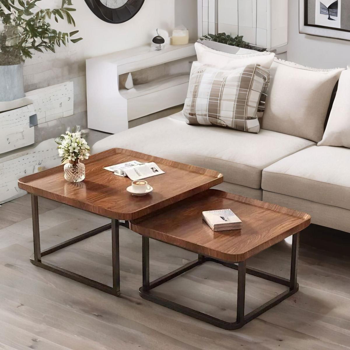 This coffee table set combines a walnut-toned surface with a sleek black base, creating a vintage industrial aesthetic that effortlessly complements a variety of home decor styles and color schemes. This versatility allows you to customize your layout according to your needs and preferences. Designed for smaller living spaces, these tables feature a nesting design where the smaller table can be neatly tucked under the larger one when not in use. This maximizes floor space and provides a unified look in your living room. Their raised edges and sturdy rectangular shape ensure stability and prevent items from sliding off, making them ideal for organising your living space. They complement long modular sofas and add balance to traditional interior settings. Crafted from durable MDF with a black metal frame, these tables offer robust construction and exceptional strength. The MDF surface is easy to clean and maintain, ensuring long-lasting durability.
