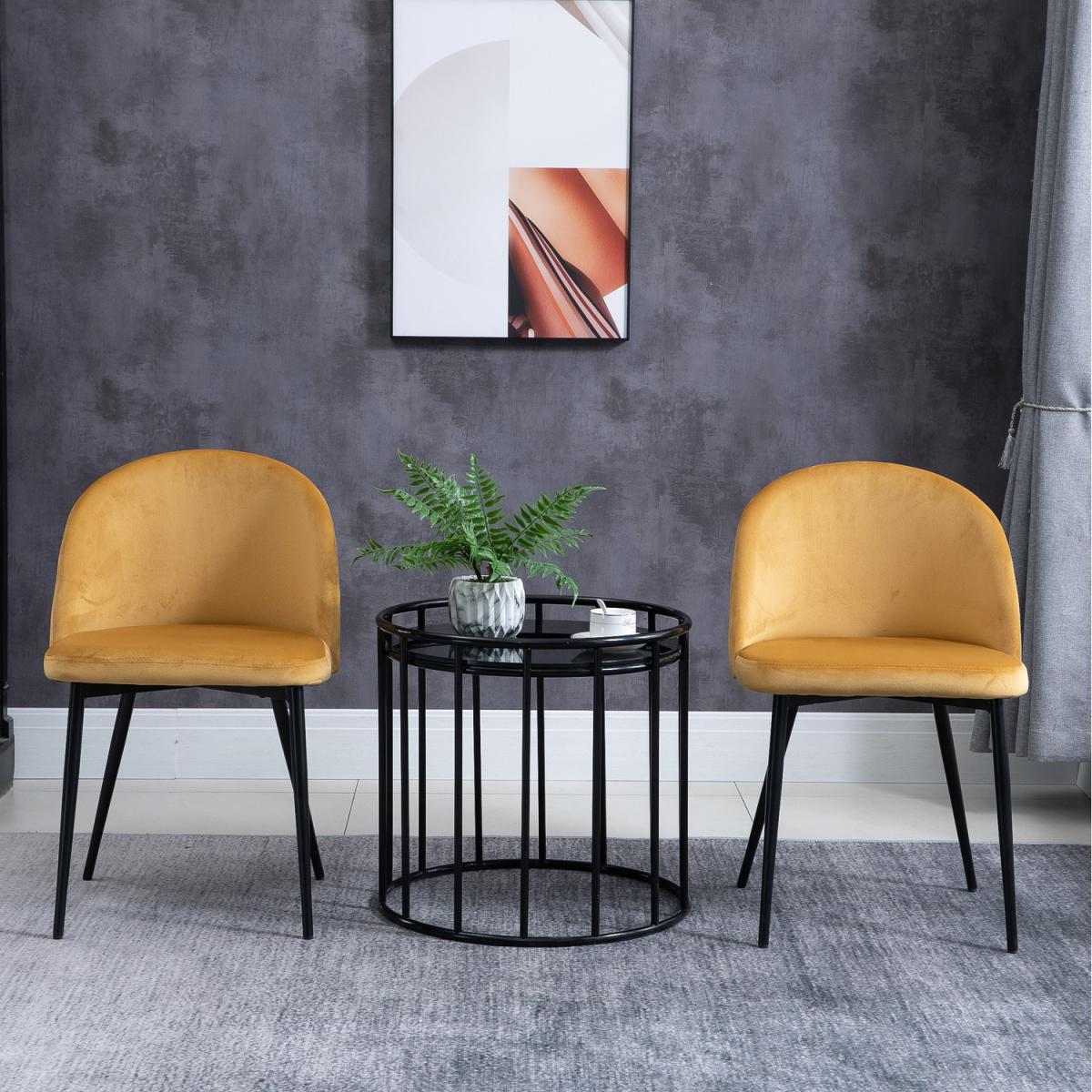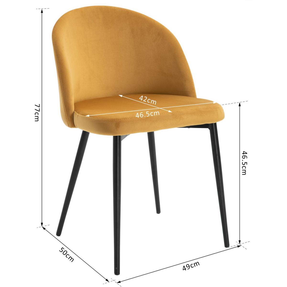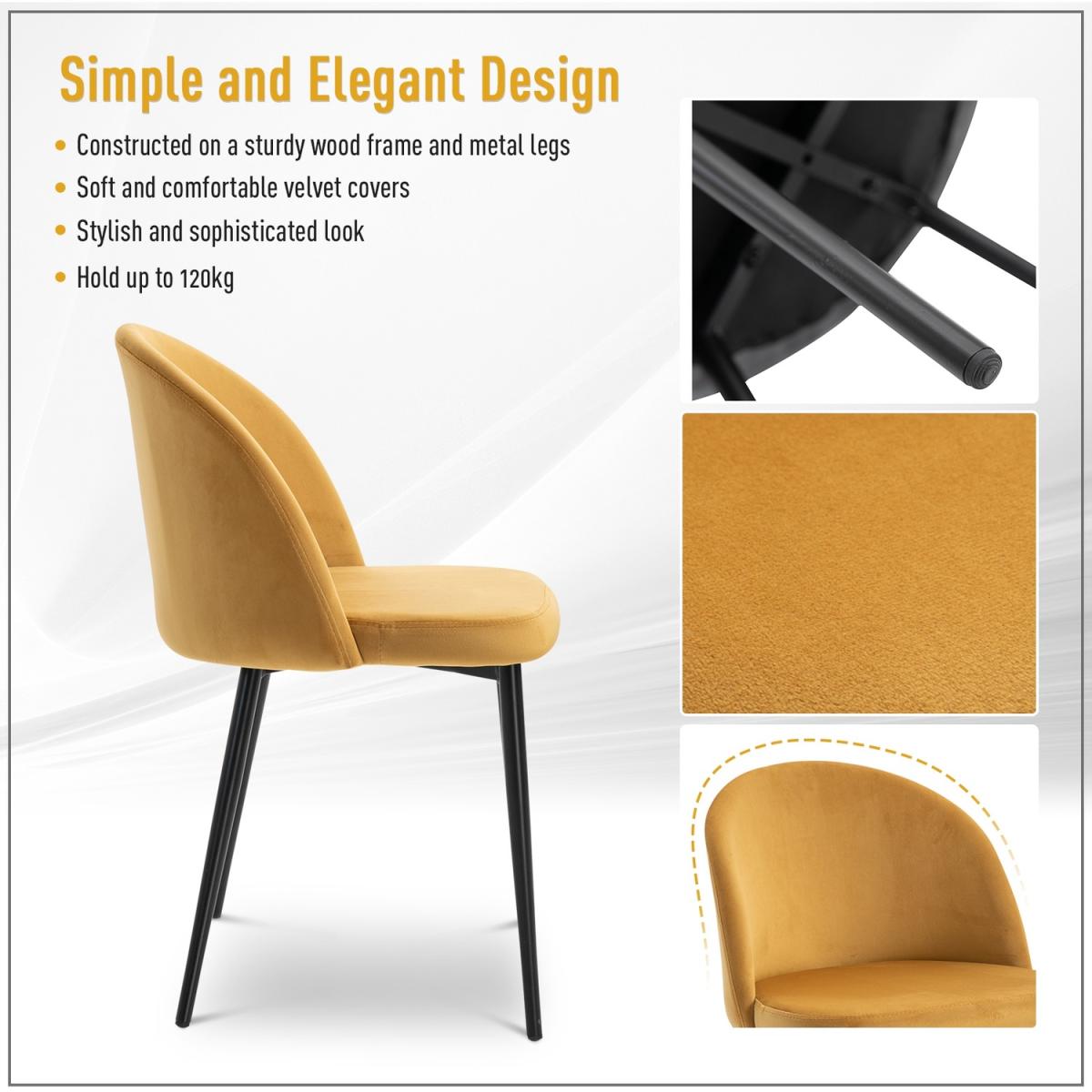 Transform your home and dining space instantly with this set of two chairs from HOMCOM. A sturdy metal frame ensures stability and durability. Armless design with smoothly curved lines gives both seats a soft and elegant look that works almost everywhere. Comfortable as it is beautiful, they combine a curved back for you to lean into, deep cushioning on the seats and a wide seat, with four long and angled metal legs that provide stability and balance, whilst the velvet-feel polyester fabric is soft and smooth on the skin. Perfect for the living room, bedroom and office.