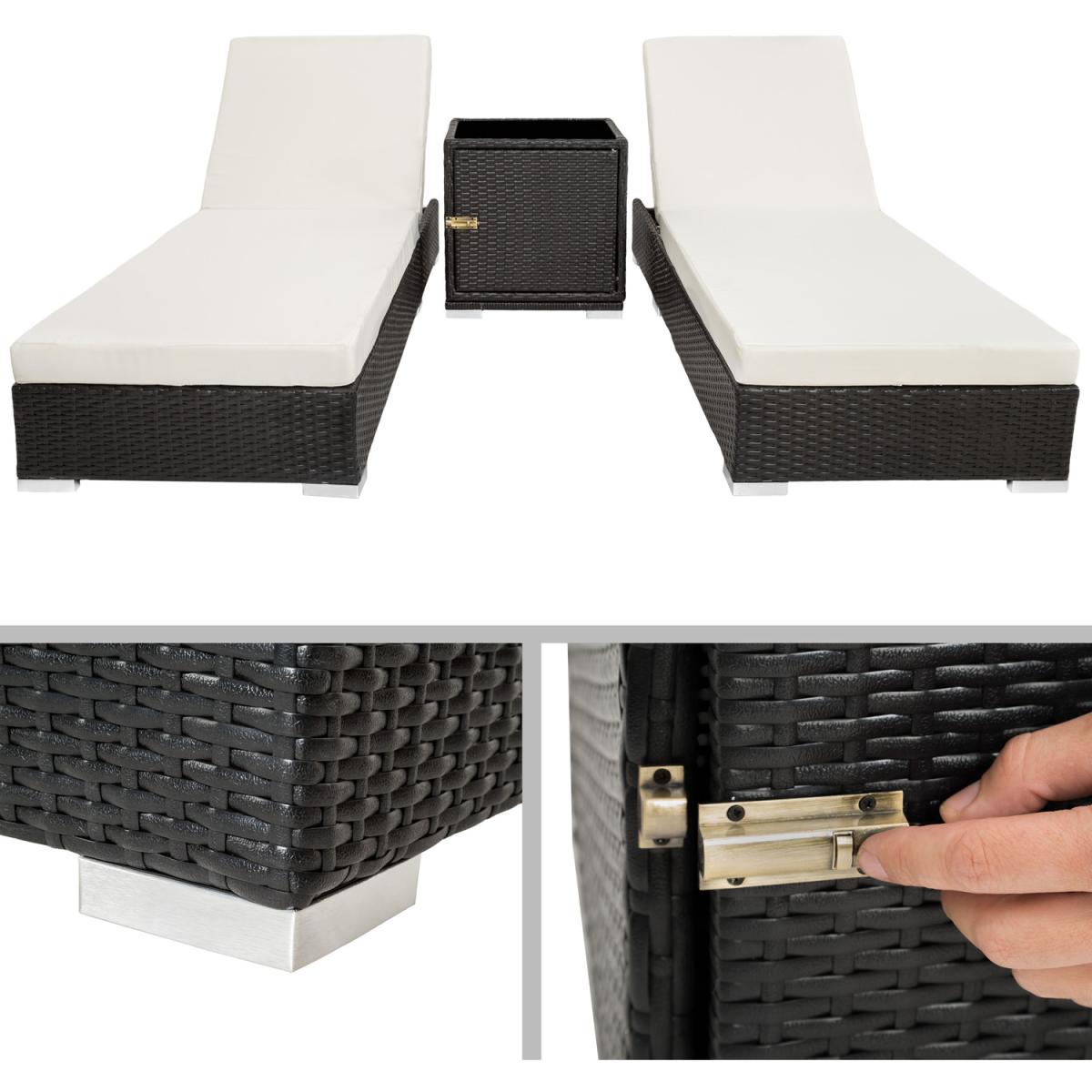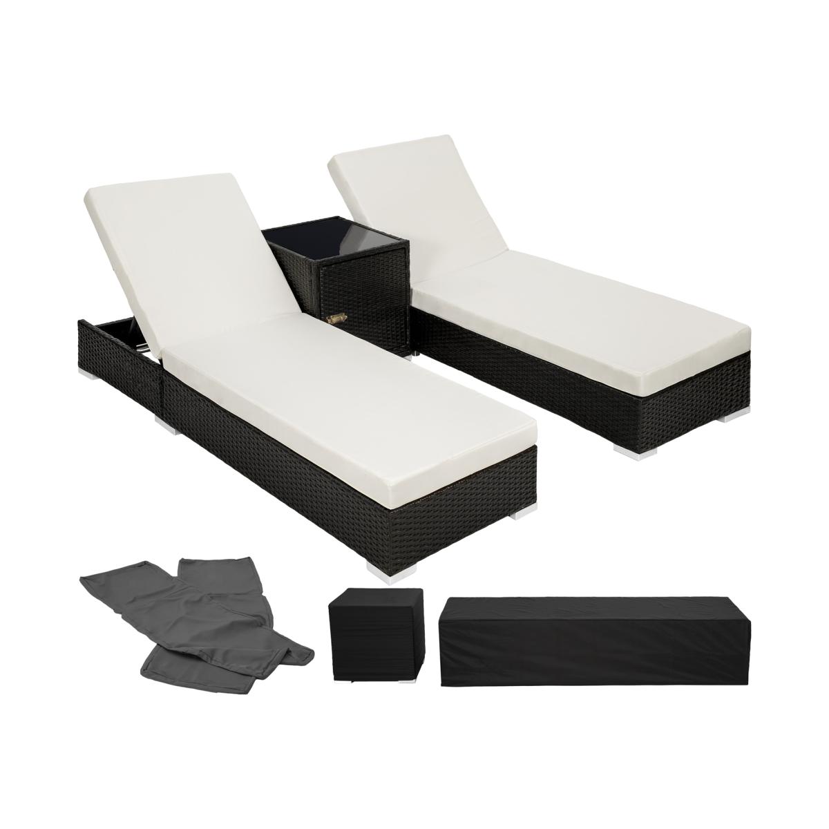 This beautiful aluminium rattan set consisting of two sunloungers with a table is perfect to relax and unwind in the home garden or on the terrace in summer. The absolute eye-catcher is also for your balcony, sauna or spa area. The sunloungers come with both beige and grey covers. The beautiful cube table has a dark-tinted glass surface and lets you store items such as towels or sunscreen inside. The backrest of each sun lounger can be adjusted five times according to your preference. The aluminium frame and high quality poly rattan weave of these garden furniture ensure a long service life outdoors. The included protective covers, one cover for the sunloungers and one cover for the table, lets you keep the garden furniture protected against the elements as well as dirt. With these sunloungers and table from tectake you are sure to enjoy relaxing hours in the sun outdoors in your garden or patio.
