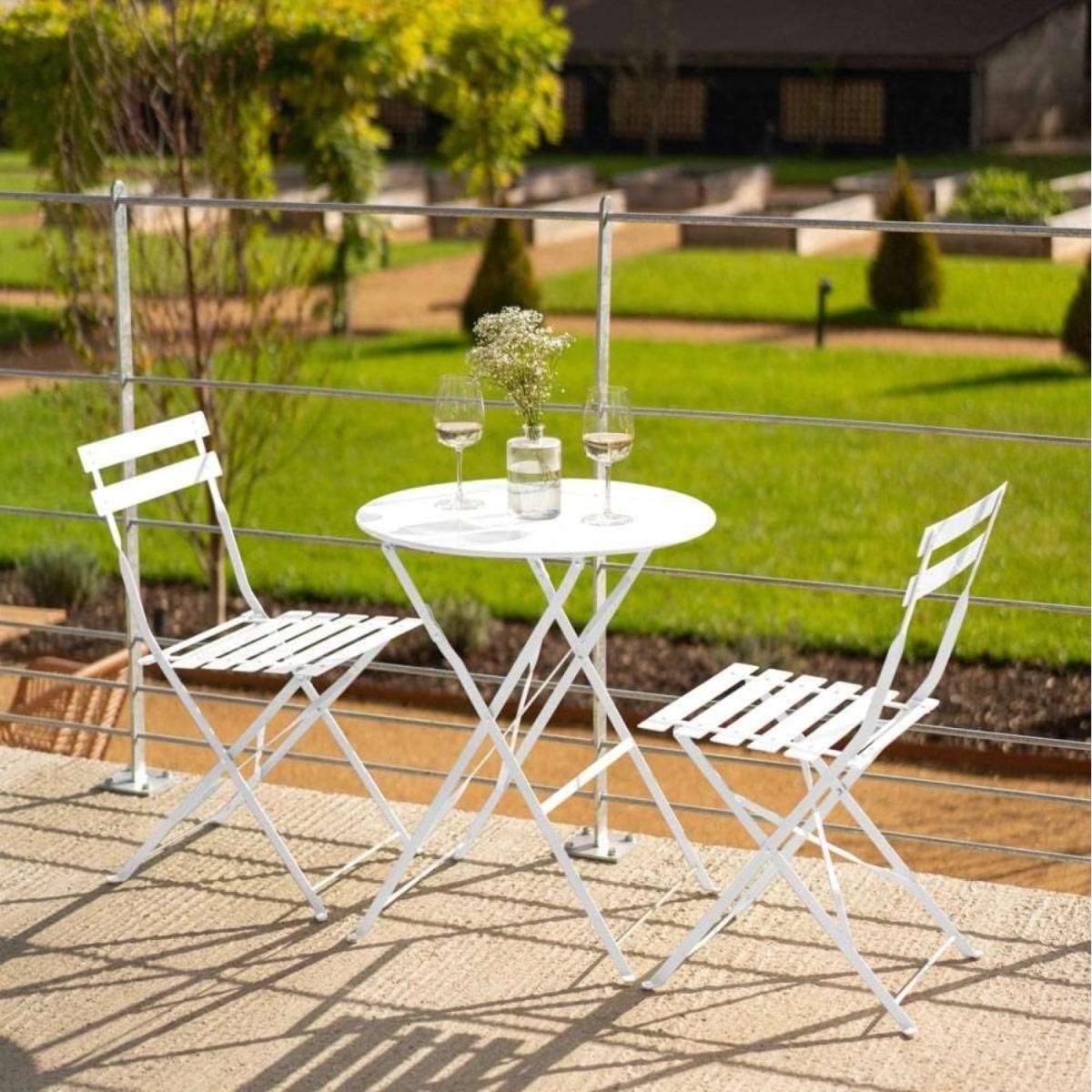 This versatile furniture set offers convenient storage with foldable chairs and a table, effortlessly transforming into a slimline state for space-saving solutions. Crafted from weather-resistant, powder-coated steel, each piece boasts exceptional strength and durability, ensuring years of use. Whether enhancing your conservatory or providing outdoor seating, this set thrives in any environment. Plus, it arrives fully assembled, requiring only a quick unfold, and it's easy to maintain, staying pristine with a simple wipe-down. Enjoy both style and practicality with this hassle-free furniture set. This is a bistro set in white