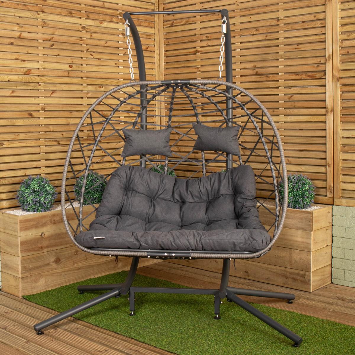 Elevate your outdoor living space with this Samuel Alexander 2 Seater Garden Hanging Egg Chair, the perfect blend of style, comfort, and durability. Designed for relaxing in luxury, this spacious egg shaped seat is ideal for couples or anyone who enjoys lounging with extra room. Whether you are soaking up the sun or curling up with a good book, this eye catching piece transforms patios, balconies, or garden corners into a cosy retreat. Built to last, the chair features a sturdy powder-coated steel frame that provides excellent support and durability. The robust structure ensures long term stability and peace of mind. The chair is woven with high quality flat PE rattan, offering a natural, elegant look with a contemporary edge. The rattan is UV resistant and durable making it ideal for outdoor use, and the flat weave design provides additional comfort and aesthetic appeal. The chair comes with a plush seat cushion in a stylish grey colour. The cushion is made from 180g polyester fabric and filled with PP foam, offering a soft yet firm surface to lounge on. Featuring a foldable design, the egg chair is easy to store or move around when not in use. Whether you are looking to store it for the winter or simply want to rearrange your space, the foldable function allows for compact storage without sacrificing comfort or style. Keep your 2 seater egg chair protected year round with the included waterproof cover. The cover provides superior protection against rain, dust, and UV rays, keeping your chair in pristine condition. The cover also includes a zipper for easy access and a drawstring cord at the bottom to ensure a snug fit, preventing wind from blowing it off. The rain cover comes with its own carry bag, making it easy to pack, store, and transport.