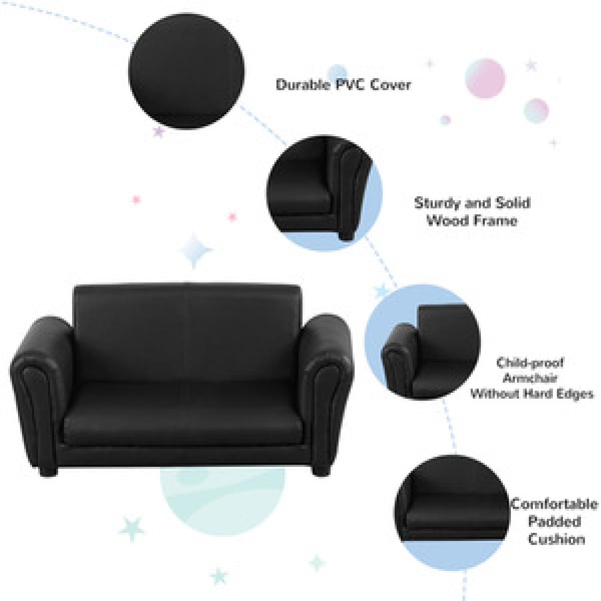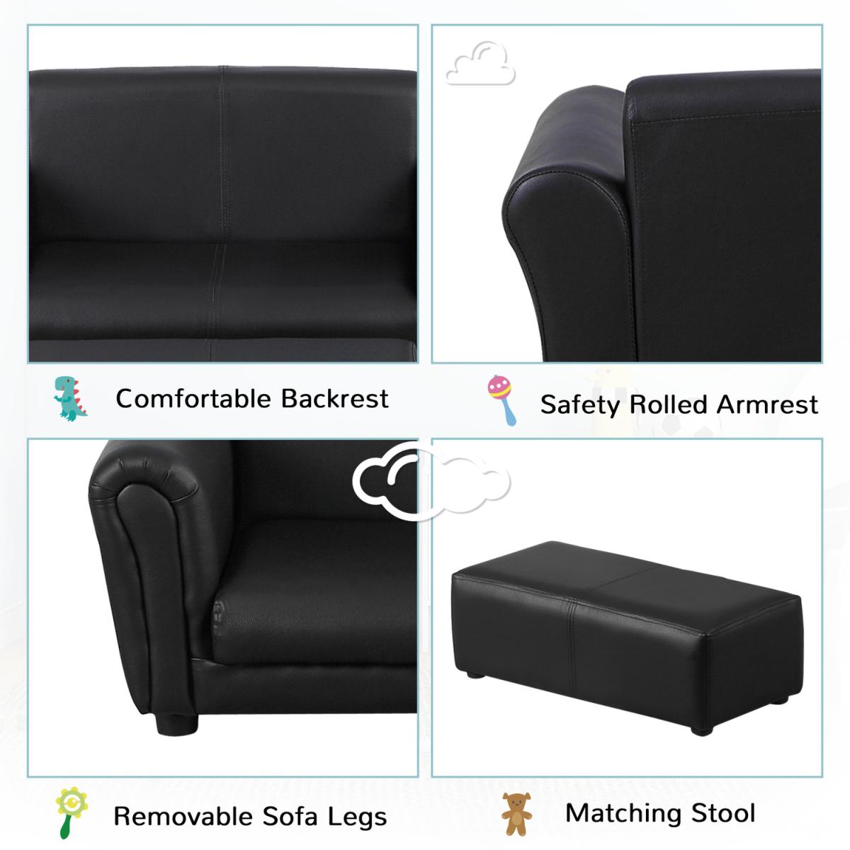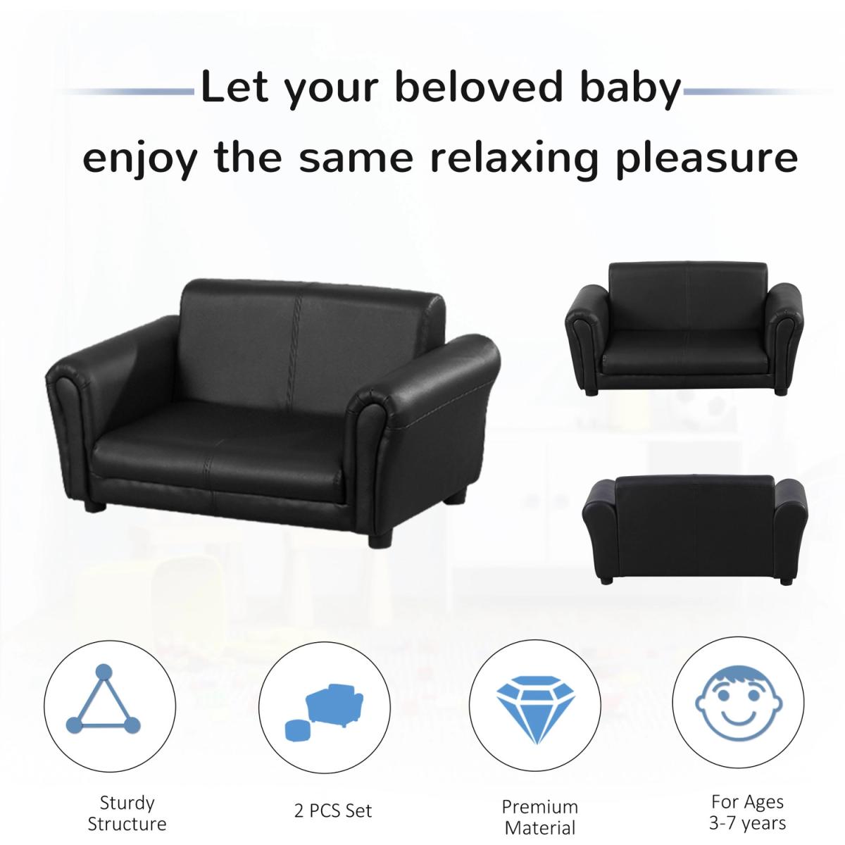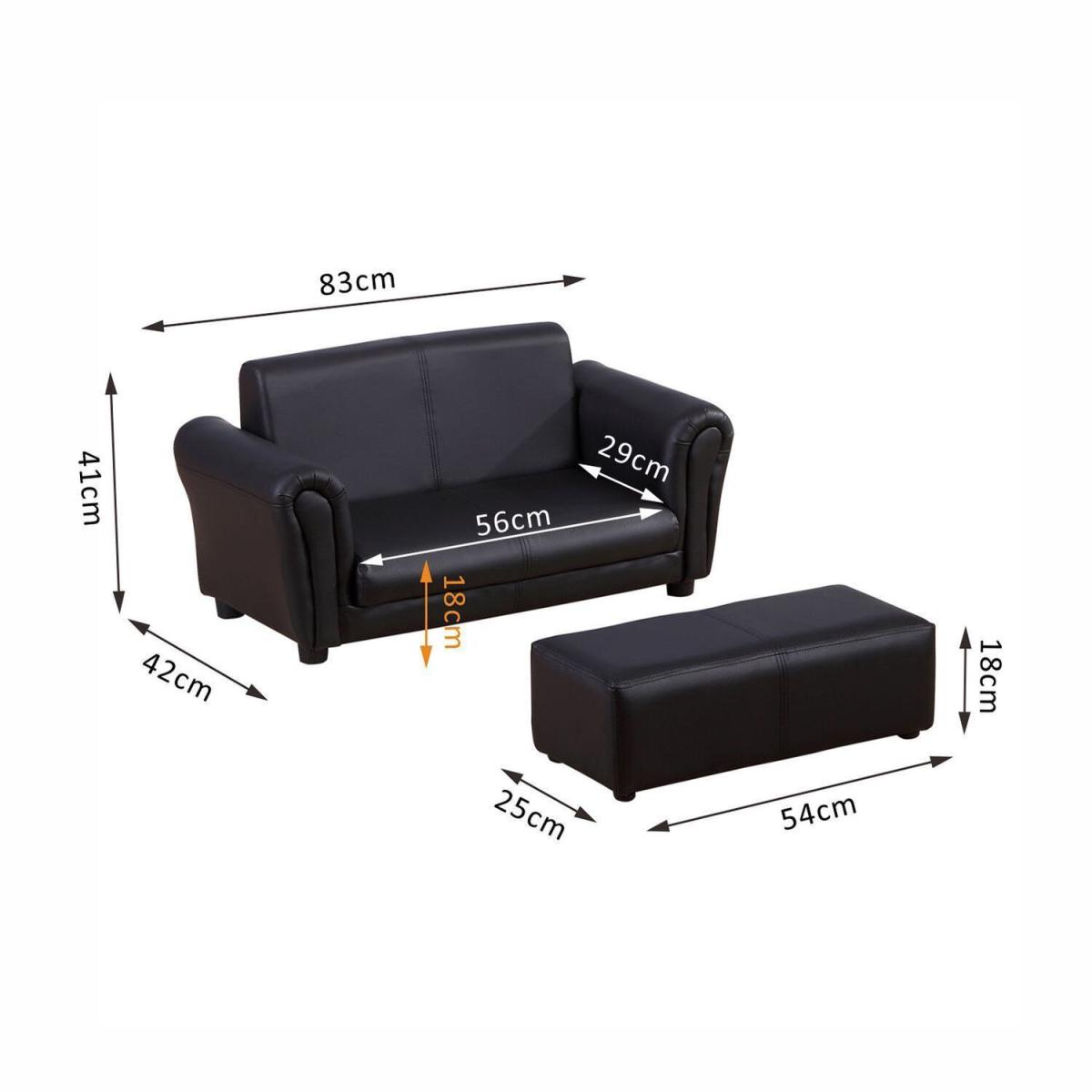 2-piece set includes 1 two-seater sofa and 1 matching footstool. 1 matching footstool included offers extra comfort. Without hard edges preventing any injury. Full wooden frame and non-slip feet on the bottom make the sofa sturdy and safe. PVC cover and filled with fire retardant foam offer a comfortable sitting experience for your kid. A great addition to any child's room or even a spot of their own in your family room. Easy to clean.