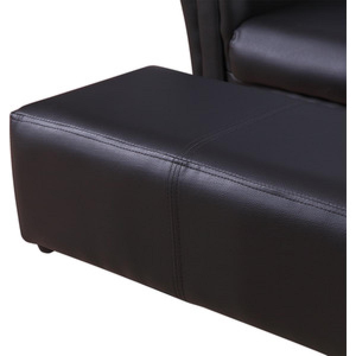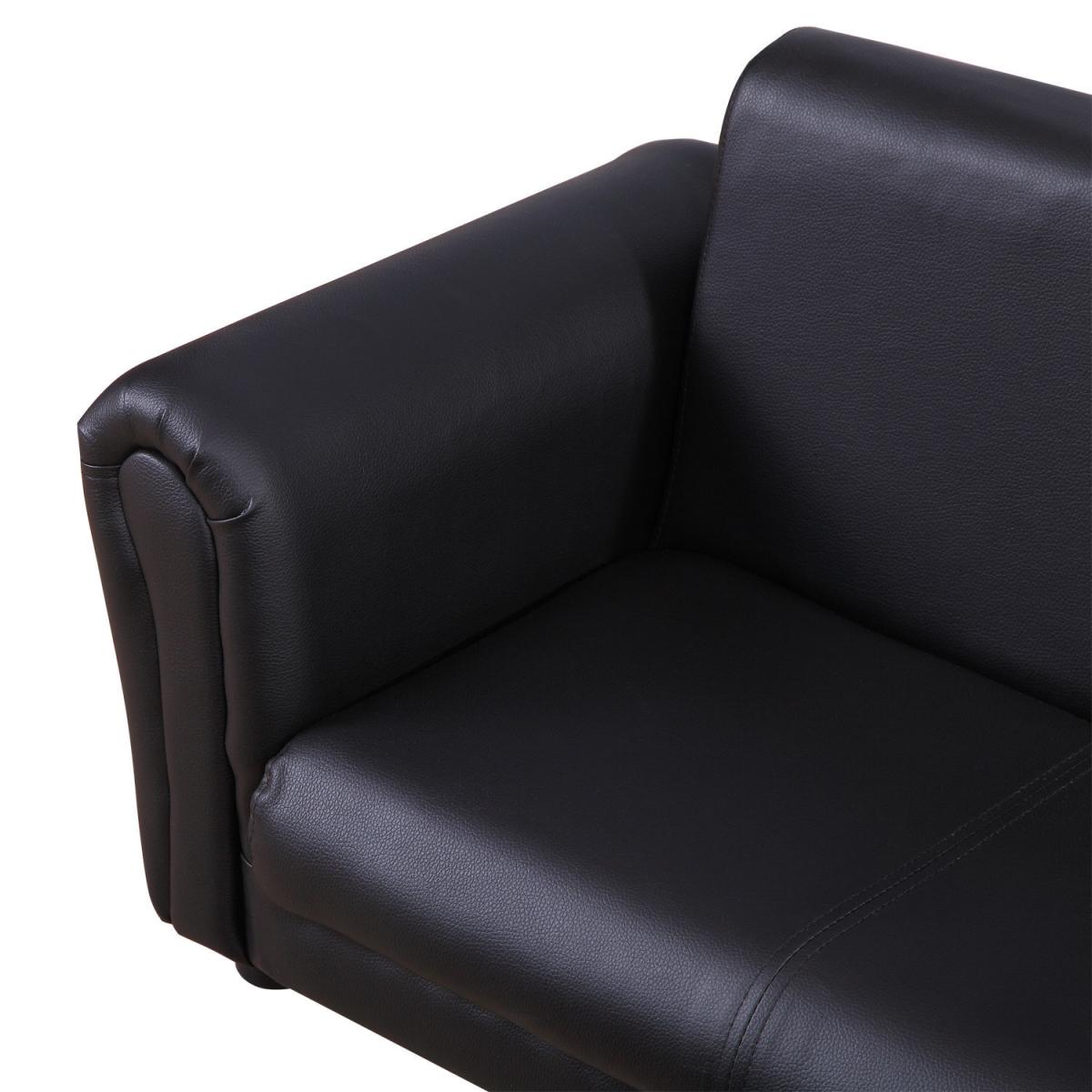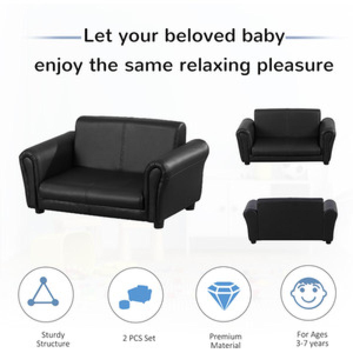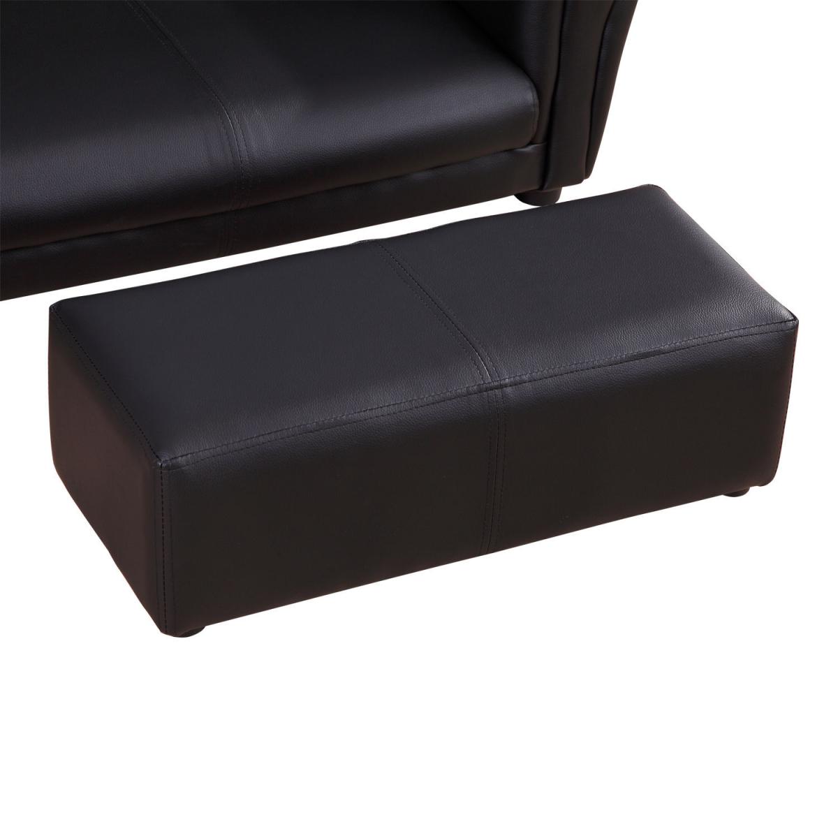 2-piece set includes 1 two-seater sofa and 1 matching footstool. 1 matching footstool included offers extra comfort. Without hard edges preventing any injury. Full wooden frame and non-slip feet on the bottom make the sofa sturdy and safe. PVC cover and filled with fire retardant foam offer a comfortable sitting experience for your kid. A great addition to any child's room or even a spot of their own in your family room. Easy to clean.