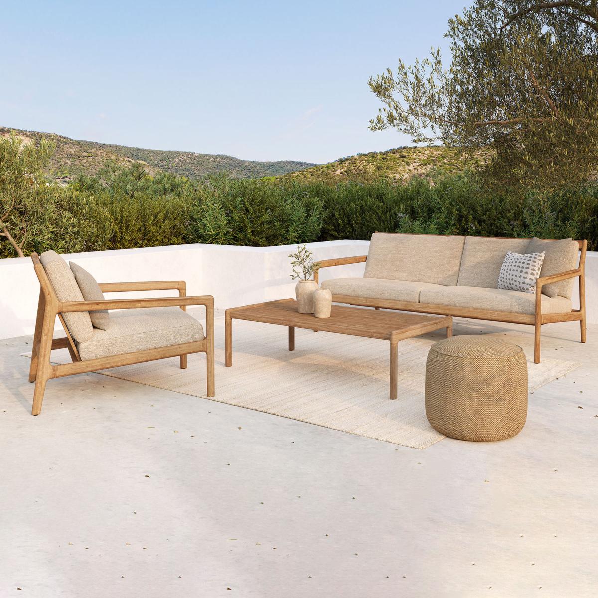 I love this outdoor sofa for its clean lines and natural materials, making it a versatile piece that works well in contemporary or coastal-inspired gardens. The teak frame adds warmth and durability, ideal for outdoor settings, while the fabric cushions keep things comfortable. Styling tip: pair it with neutral-toned cushions or textured throws for a cosy touch, and add complementing wooden or wicker furniture to create a cohesive, relaxed outdoor lounge. It's perfect for anchoring a laid-back garden seating area or even a covered balcony, blending practicality with understated style.