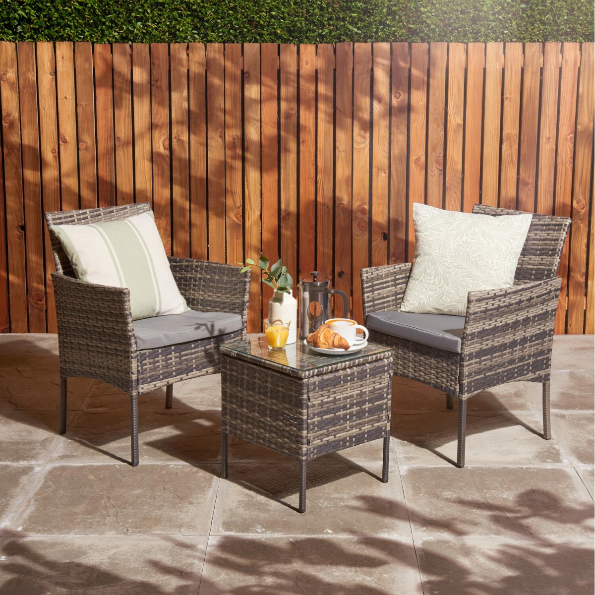 Unwind outdoors with friends & family, seat upto 2 people in style. Sleek, elegant garden furniture set includes: 2 x Chairs 1x Glass Coffee Table 2 x Padded Cushions. Make the most of your outdoor space and create a compact, comfy area to sit back and relax in the great outdoors. A perfect addition to any patio, garden, lawn area conservatory or courtyard area to enjoy to sun. Extra plush 8cm thick cushions in ashen grey, easy clean zip cushions that are padded & damp resistant. Garden furniture chairs have a supportive backrest, cushions and armrests. All tools & instructions included. Easily wipe clean & removable cushion covers keeps the furniture looking the best all year round