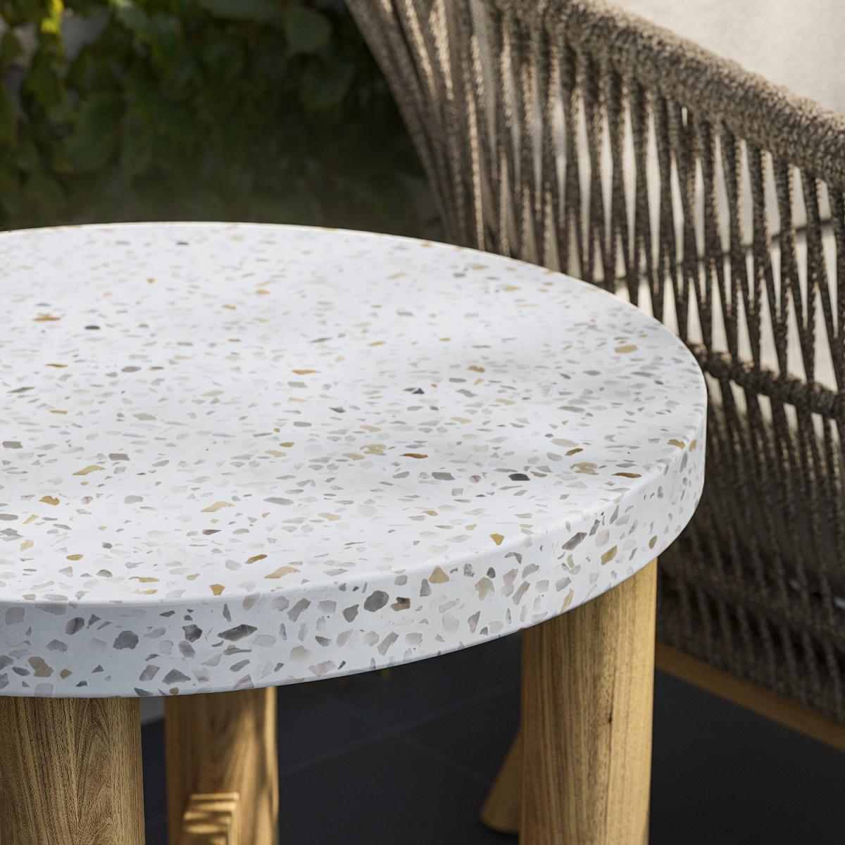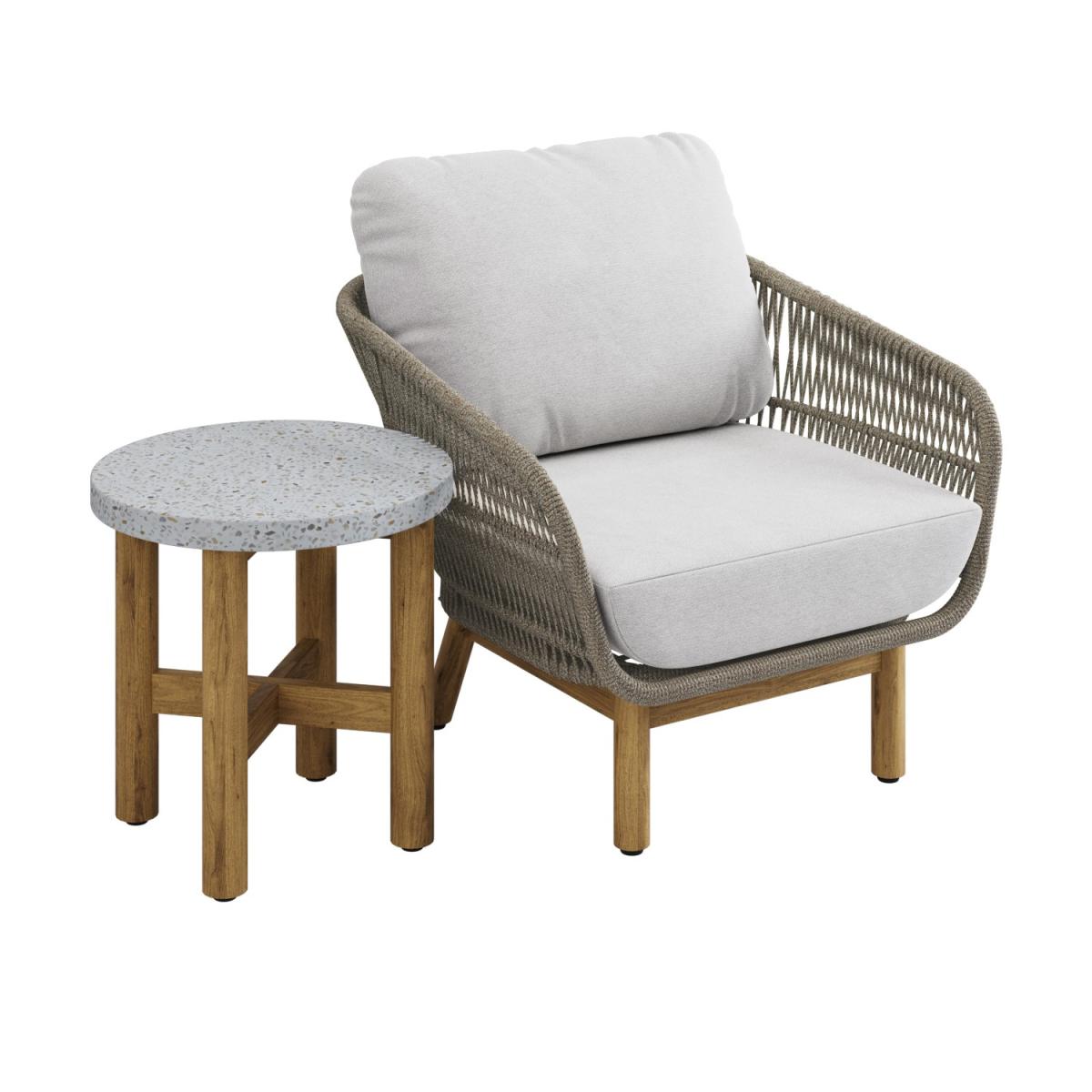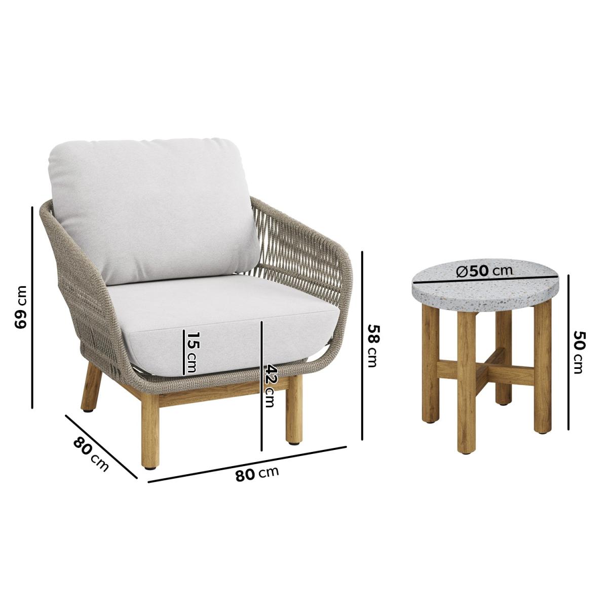 All about me This cosy bistro set makes a stylish, neutral addition to any outdoor space, conservatory or even a balcony. The two armchairs feature comfy, luxurious cushions that're perfect for relaxing on those warm summer evenings. The cushion covers are removable and easy to clean by hand or at 30 degrees in the washing machine. Enhance the life of your garden furniture- This product has been designed to be used outdoors. To make the most of your furniture, we recommend that you store it indoors, move it to a sheltered position or protect it by covering it up in bad weather and over the winter period. Why not invest in one of our garden stores? They keep upholstery, such as cushions, dry to prevent mould or mildew from forming. Need to know Chair dimensions:W80 x D80 x H69 cm (12 kg) Table dimensions: W50 x D50 x H50 cm (18 kg) Max supported weight per seat: 120 kg Max supported weight per table: 35 kg Seats: 2 people Cushion thickness: 15 cm Colour: Brown mix, cream, and brown Finish: Rattan, upholstery, and natural wood Material: Twist rattan, aluminium frames, acacia wood legs, Terrazzo tabletops, cotton-filled cushions For use:Outdoors and indoors (suitable for wooden floors) Assembly required:Yes Total number of boxes: 1 What's included? 2 x Chairs 1 x Side table
