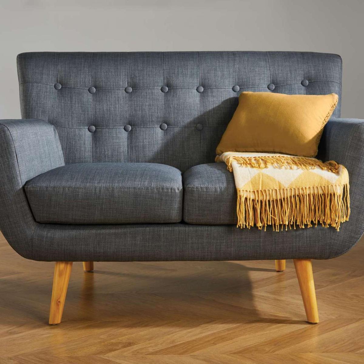 I love the grey three-seater for its versatile retro-modern design, which makes it a great statement piece that can easily complement both contemporary and vintage-inspired interiors. Its neutral palette offers a perfect backdrop for colourful cushions, throws, or even patterned rugs, allowing flexibility in styling. This sofa works particularly well in mid-century or Scandinavian schemes, thanks to its clean lines and tapered wooden legs. For practical styling tips, consider pairing it with textured cushions to add depth or a soft, cosy throw to make it inviting. Its compact size also makes it ideal for smaller living rooms or cosy corner setups, offering a stylish yet functional seating option.