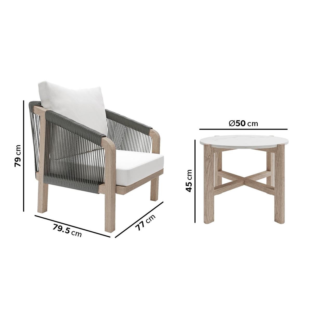 Features we love Stunning 2 seater Solid, Natural Teak Garden Bistro Set Side table features beautiful white sintered stone top Twisted and wrapped rope adds detail Removable and washable seat and back cushions Light-washed wooden frame table and chairs All about me This stunning solid natural teak bistro set, is the ultimate in style and sophistication. The two chairs are crafted from beautiful teak wood, wrapped with Olefin rope, and finished with plush off-white seat and back cushions, that provide incredible comfort - and can be removed and washed when required. The gorgeous table features a sintered stone table top and solid teak legs - this on trend design is perfect for both balconies to enjoy the city skyline - or a quite corner in the garden to sit an relax in peace Enhance the life of your garden furniture- This product has been designed to be used outdoors. To make the most of your furniture, we recommend that you store it indoors, move it in a sheltered position or protect it by covering it up* in bad weather and over the winter period. Why not invest in one of our garden stores to keep upholstery (such as cushions) dry, and to prevent mould and mildew forming. *Did you know we now have our own range of garden covers, consisting of 4 different sizes. Need to know Table dimensions:W50 x D50 x H45 cm Each chair dimensions:W77 x D79.5 x H79 cm Max supported weight per seat: 150 kg Overall weight: 42.4 kg Seats: 2 Colour: Weathered teak, Khaki, off-white, and white Finish: Wood, rope, fabric and stone Material: Teak wood, Olefin weaving (rope), polyester fabric (cushions) and sintered stone (tabletop) For use: Outdoors or indoors (suitable for wooden floors) Assembly required: Yes - attach table legs Total number of boxes: 3 What's included? 1 x Coffee table 2 x Chairs