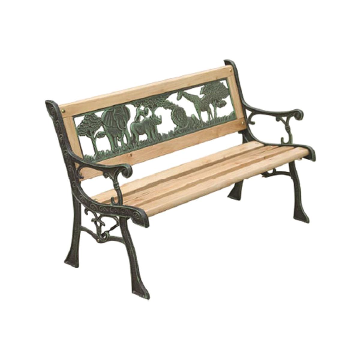 Classic garden bench for children. Suitable for 2 children, aged 2 - 8 (approx.) A classic 4 slat wooden seat. Cast iron legs. Decorative arms, and ornate animal design PVC back. This is a small sized bench suitable for children.
