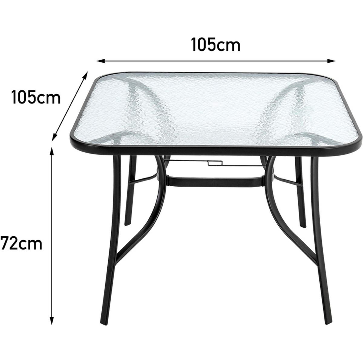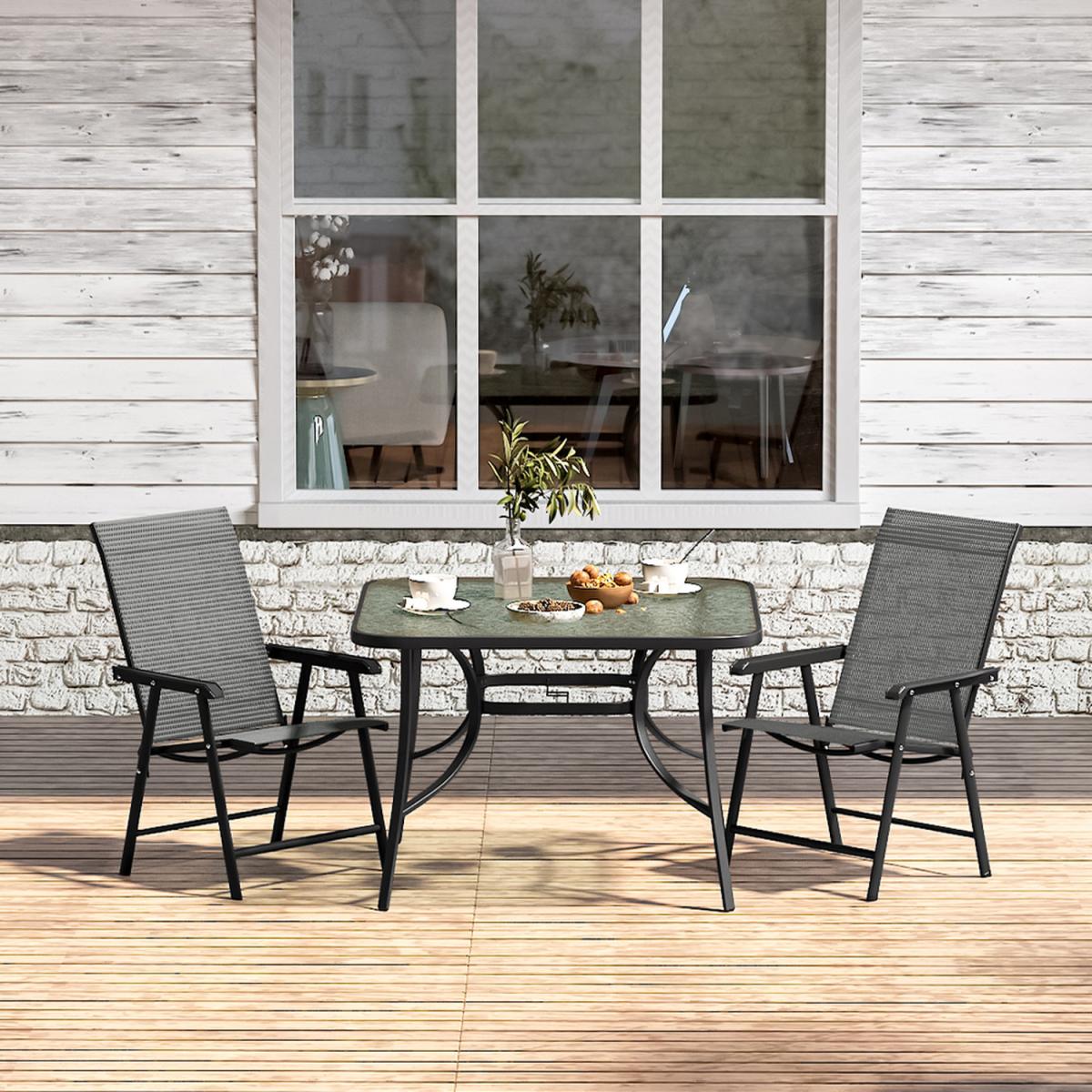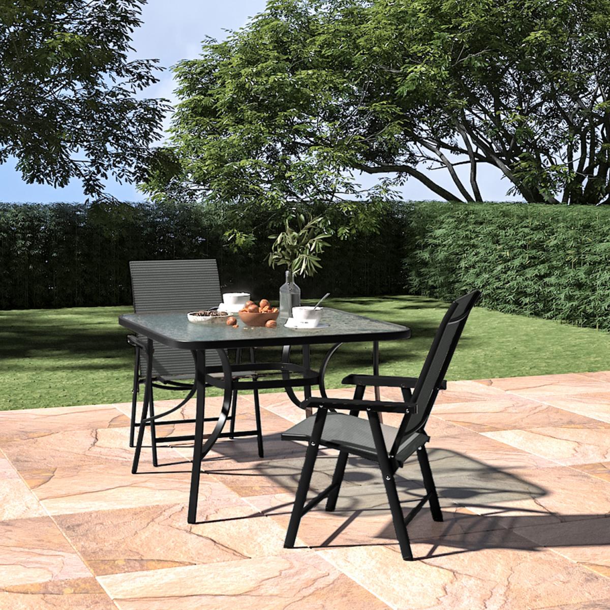 This outdoor bistro set, with its delicate appearance and high quality, can make a great experience for you. Modern and practical 3-piece patio furniture set increases a fashion style to your garden or porch. It includes a transparent rippled tempered table and 2 foldable fabric chairs. There's a hole in the middle of the table, where you can place a parasol to protect you from the sunlight. In a contemporary style, it's perfect to compliment your garden or balcony.