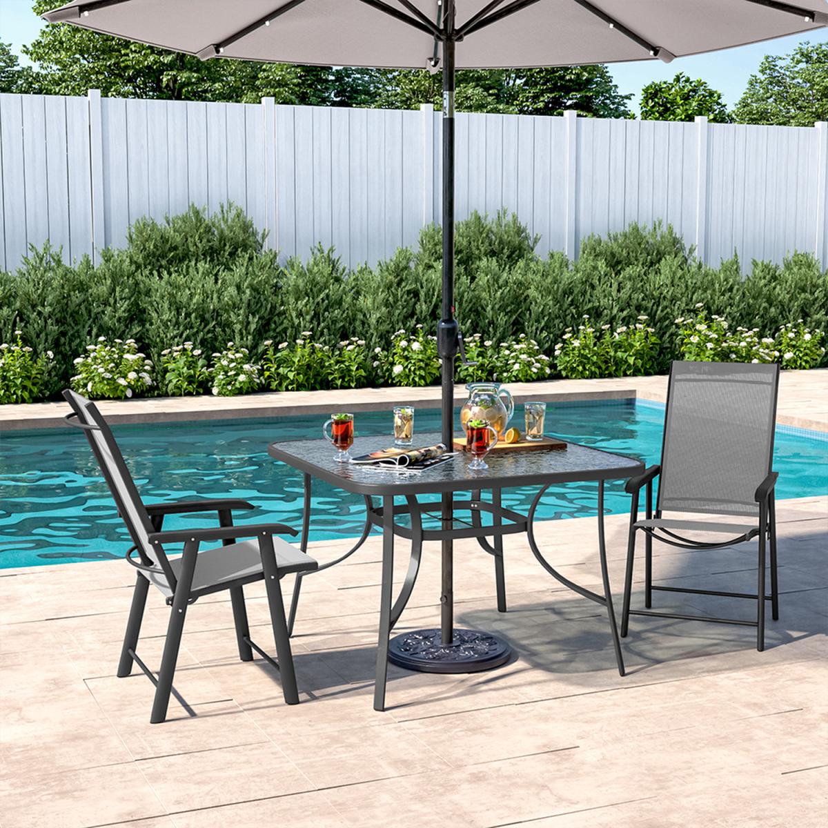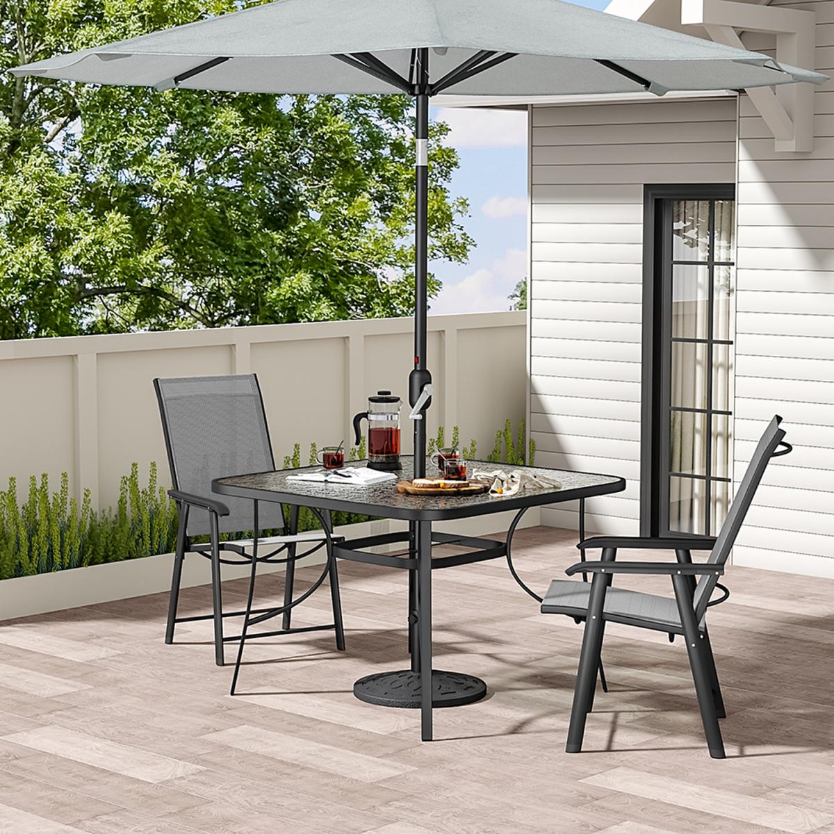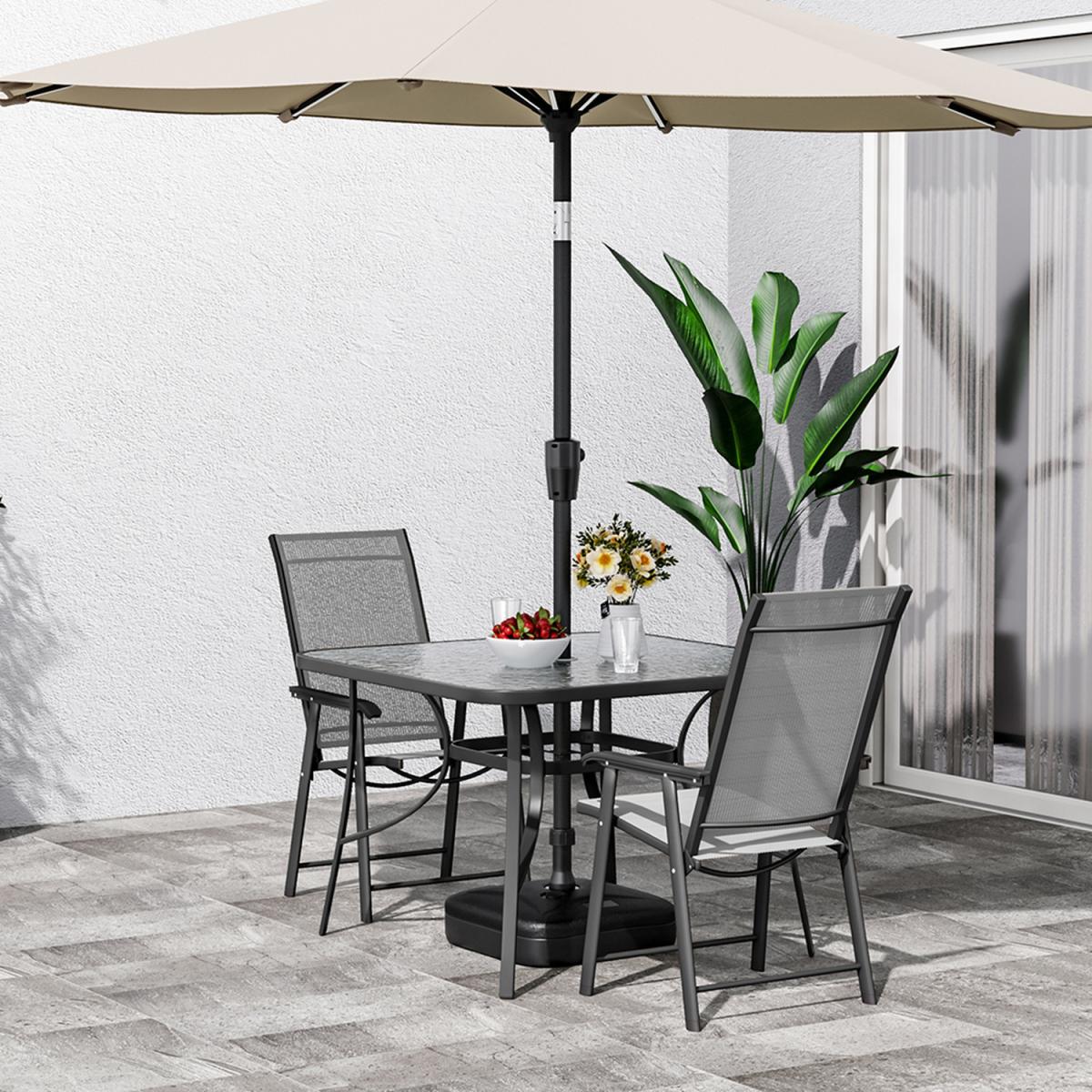 This outdoor bistro set, with its delicate appearance and high quality, can make a great experience for you. Modern and practical 3-piece patio furniture set increases a fashion style to your garden or porch. It includes a transparent rippled tempered table and 2 foldable fabric chairs. There's a hole in the middle of the table, where you can place a parasol to protect you from the sunlight. In a contemporary style, it's perfect to compliment your garden or balcony.