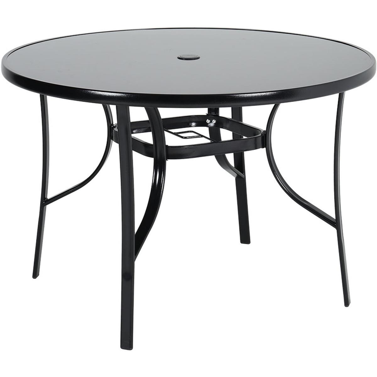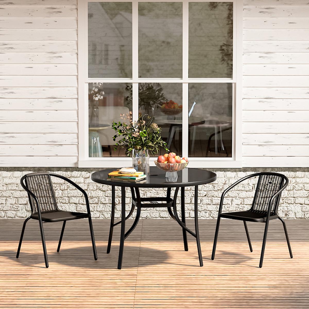 This outdoor bistro set, with its delicate appearance and high quality, can make a great experience for you. Modern and practical 3-piece patio furniture set increases a fashion style to your garden or porch. It includes a tempered table silked in black and 2 plastic stacking chairs. There's a hole in the middle of the table, where you can place a parasol to protect you from the sunlight. In a contemporary style, it's perfect to compliment your garden or balcony.