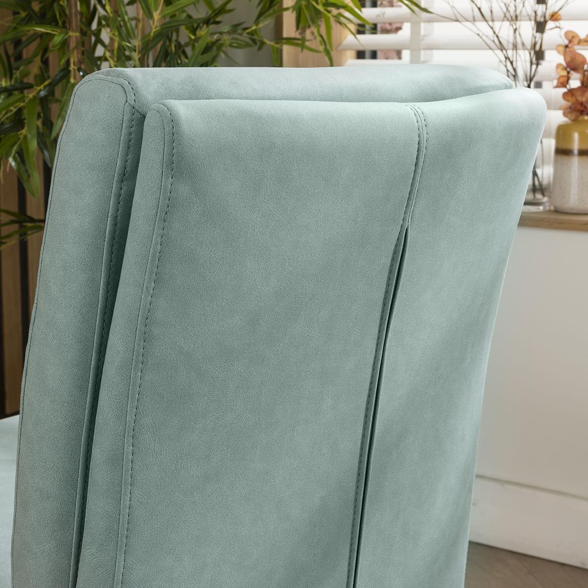 This set of 2 leather dining chairs, perfect for adding a touch of sophistication to your dining space. Crafted with premium PU leather in a refreshing mint green shade make the kitchen chairs very easy to clean. These dining room chairs exude contemporary charm and industrial-chic, elevating your decor to a new level. The luxurious PU leather upholstery not only offers a soft and comfortable seating experience but also ensures easy maintenance, making these chairs a practical choice for everyday use. The mint green hue adds a pop of color to your dining area, creating a fresh and inviting atmosphere. Designed with a focus on minimalism, these chairs feature sleek brushed stainless steel legs that provide sturdy support while effortlessly blending with various interior styles. The slender leg design adds a modern touch, accentuating the clean lines of the chairs. With this set of 2 dining chairs, you can effortlessly create a stylish and inviting dining space that reflects your refined taste. Enjoy comfortable seating, exquisite design, and the lasting allure of mint green with our meticulously crafted dining chairs. Elevate your dining experience with this chic addition to your home. W65cm D49cm H89cm Set of 2 Faux PU Leather Dining Chairs Pair them with the matching corner bench