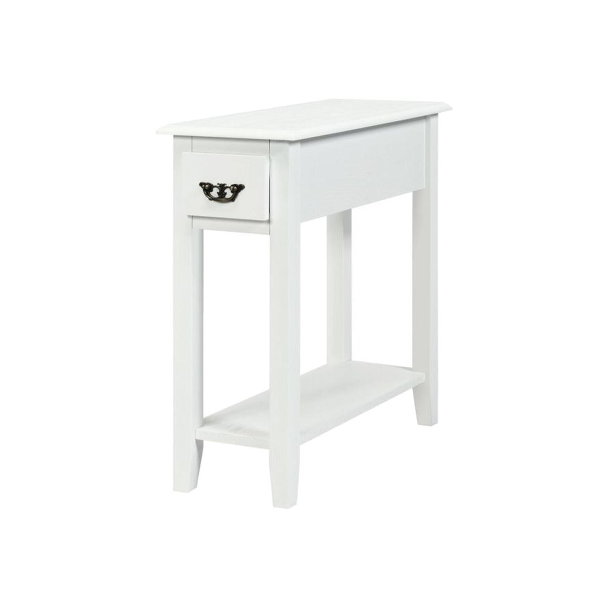 I’m a fan of this white two-tier side table for its clean lines and subtle vintage handle, which let it sit comfortably in Scandi, coastal or modern-farmhouse bedrooms. The crisp finish brightens small rooms and works well alongside muted linens or natural-wood furniture. Styling is straightforward: top it with a slim-profile lamp, a small stack of books and a pot plant or photo frame, then use the lower shelf for a woven basket or bedside necessities. The single drawer keeps clutter hidden, so you can maintain a neat, relaxed look without sacrificing storage.